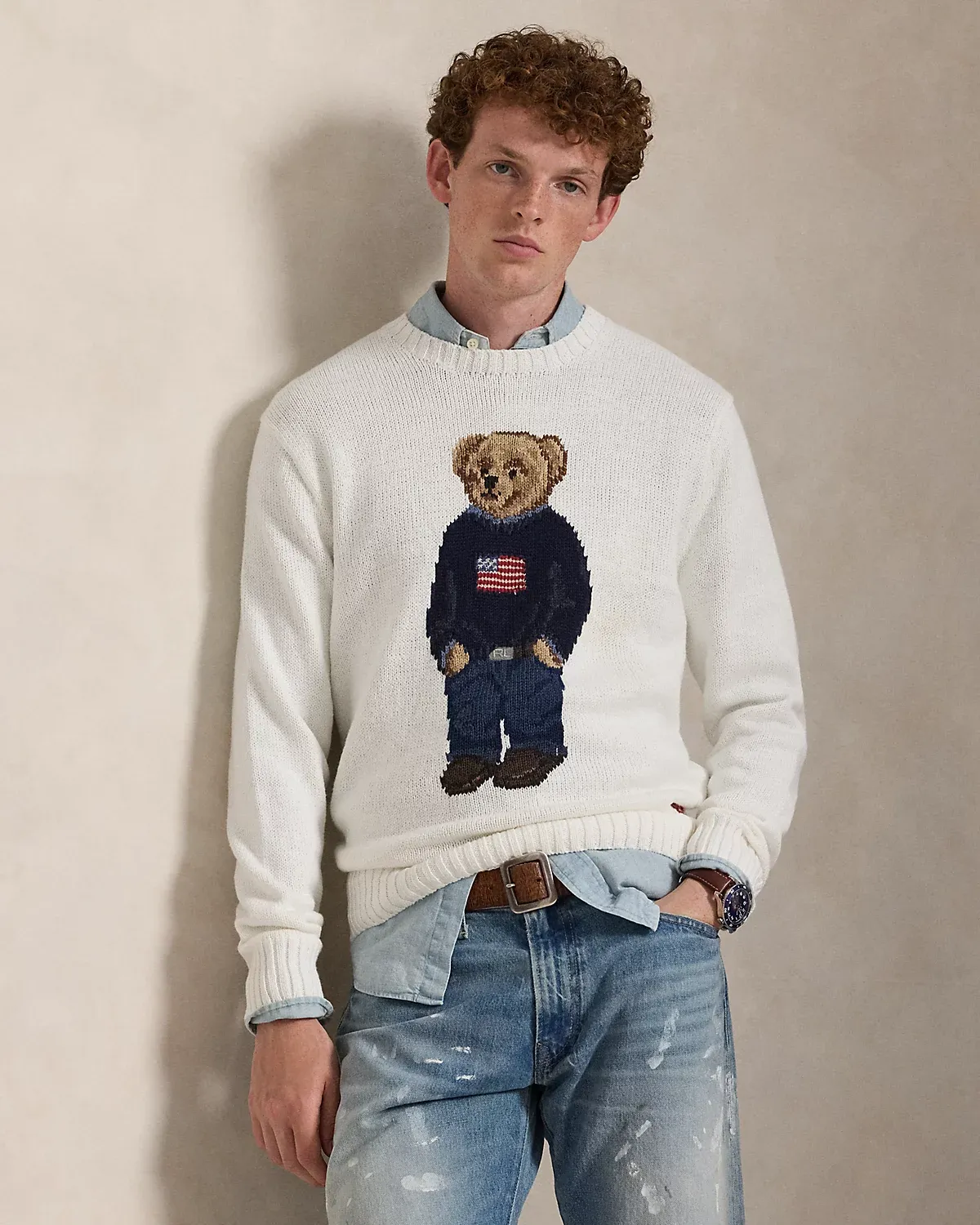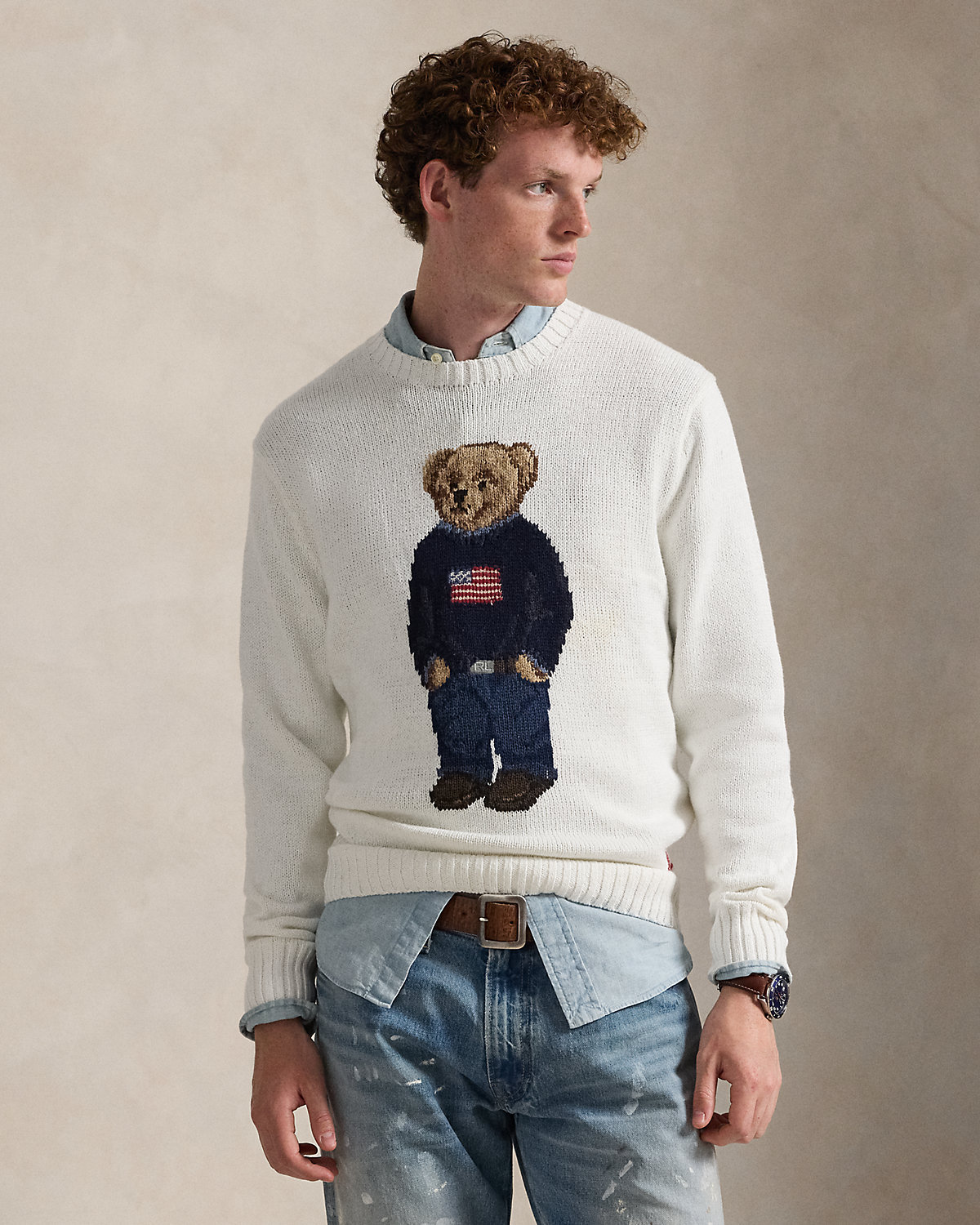 An icon sporting an icon, our Polo Bear wears the Ralpthth Lauren flag sweater on this unisex cotton-and-linen layer. Our founder’s initials are hand-embroidered at the left hem for a signature finish.
