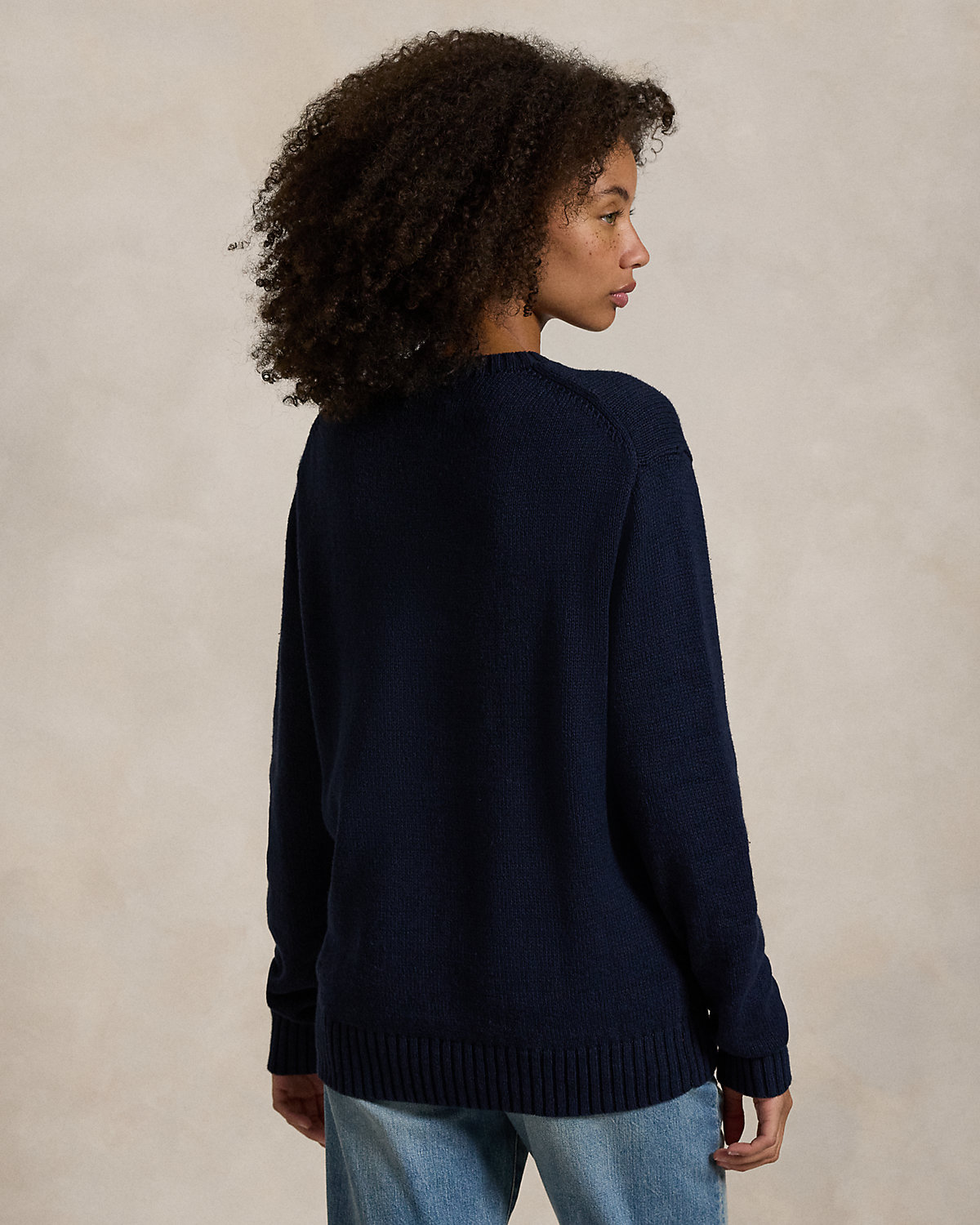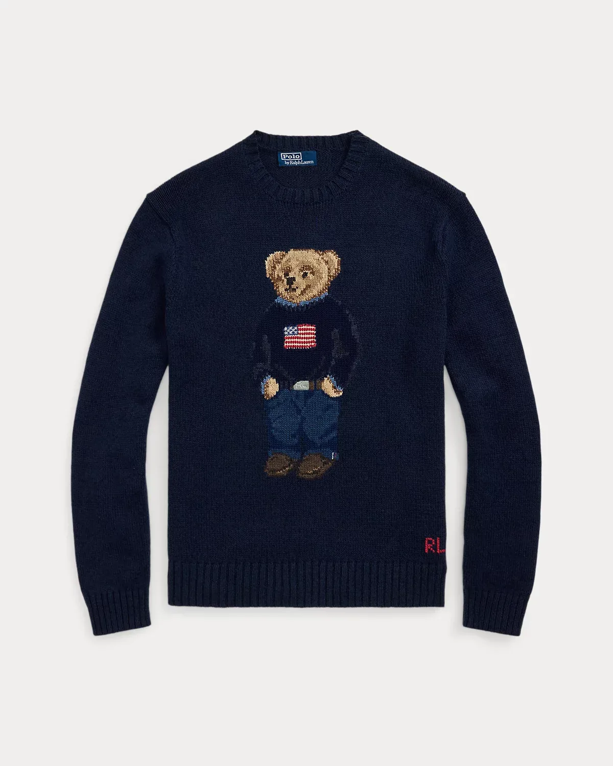 - Crewneck. Long sleeves with rib-knit cuffs. Polo Bear intarsia-knit at the center front with embroidered details. Rib-knit hem. “RL” hand-embroidered at the right hem.