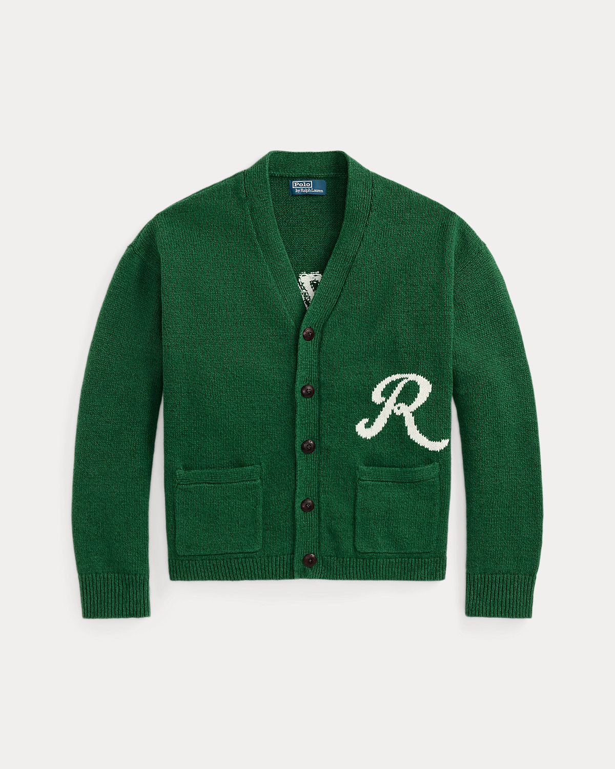 • “R” intarsia-knit at the left chest. “Ralph” intarsia-knit at the center back.