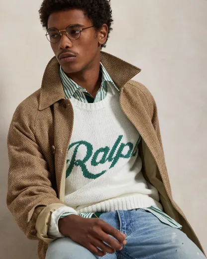 - “Ralph” intarsia-knit at the center front.