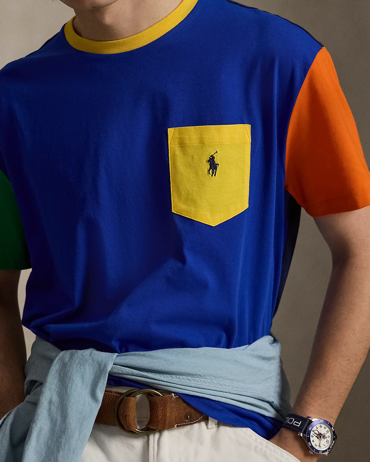 This cotton pocket T-shirt gets the Polo treatment with a bold color-blocked design and our signature embroidered Pony.