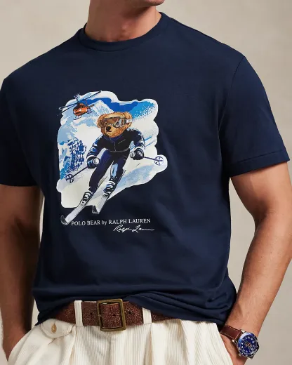 Inspired by classic spy films, this cotton T-shirt features a snowy landscape with a helicopter and our beloved Polo Bear skiing in style.