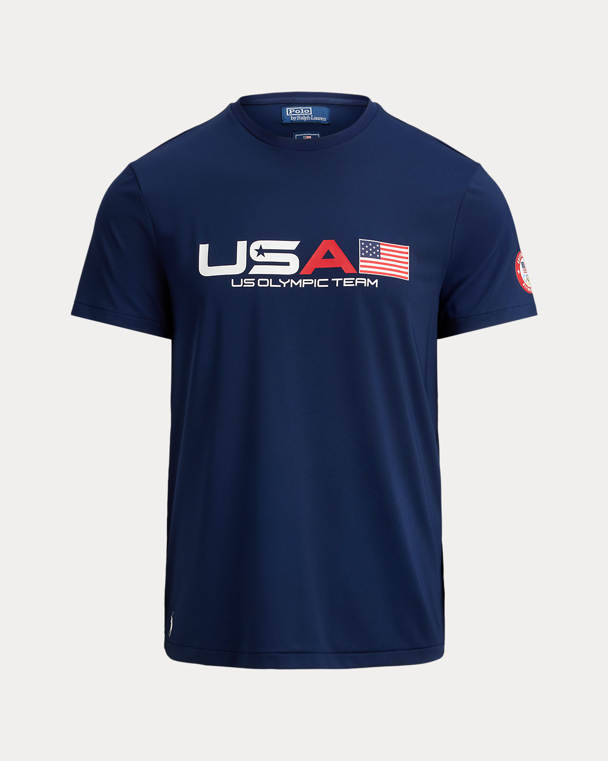 - Crewneck. Short sleeves. Official logo patch of the U.S. Olympic Team at the left sleeve.