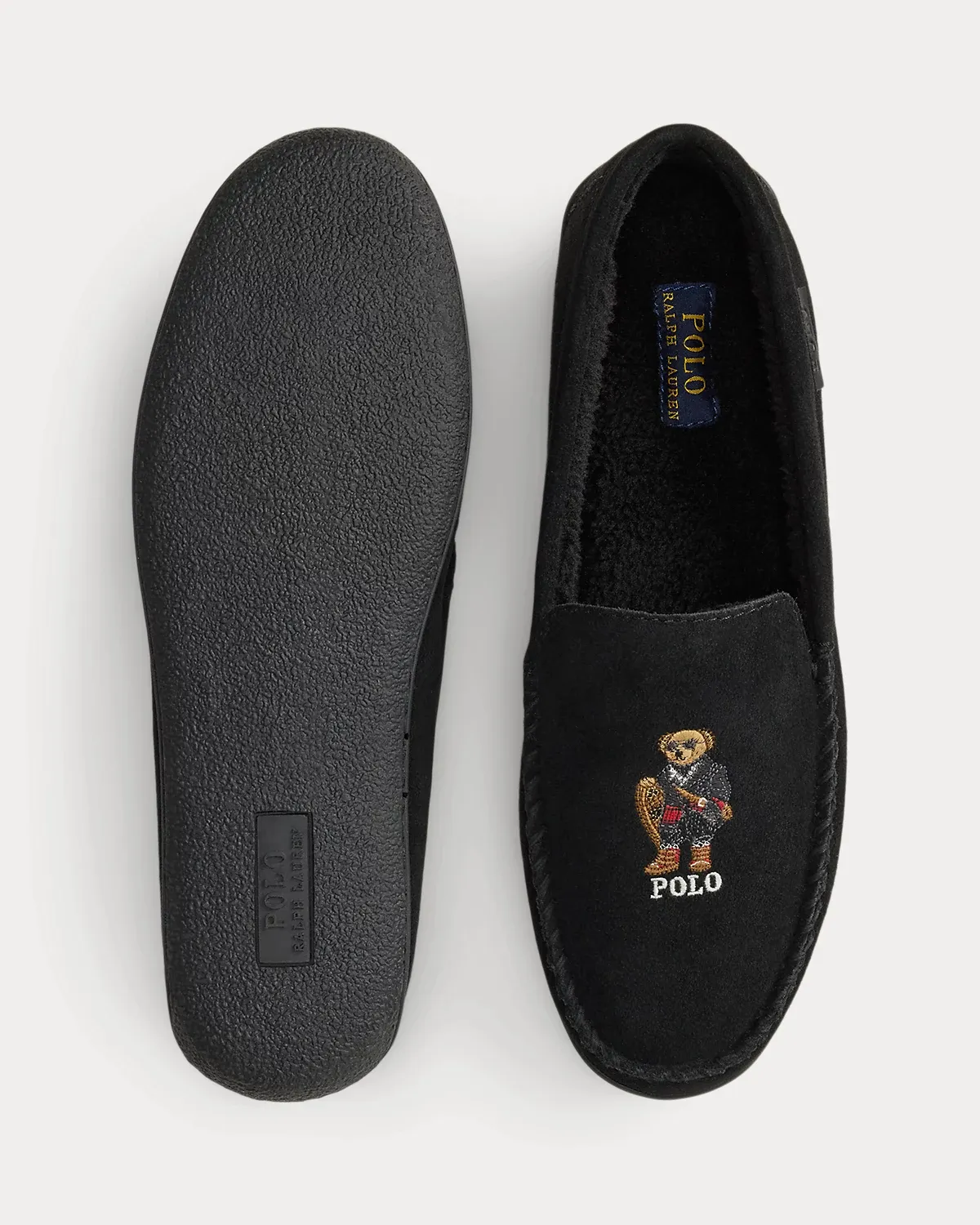 Dressed for the season in a duffel coat, plaid pants, and Fair Isle hat, the Polo Bear adds a festive touch to these suede slippers. Designed with a plush faux-shearling insole for comfort, they are finished with hand-stitching at the vamp.