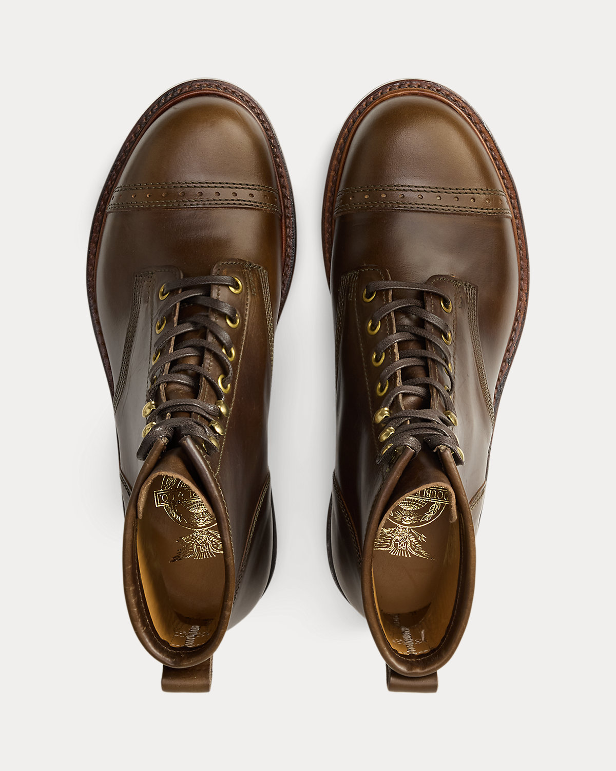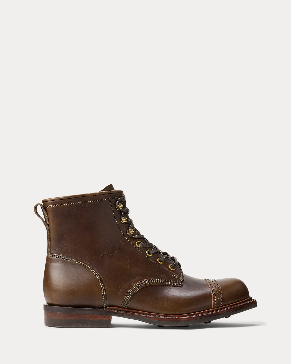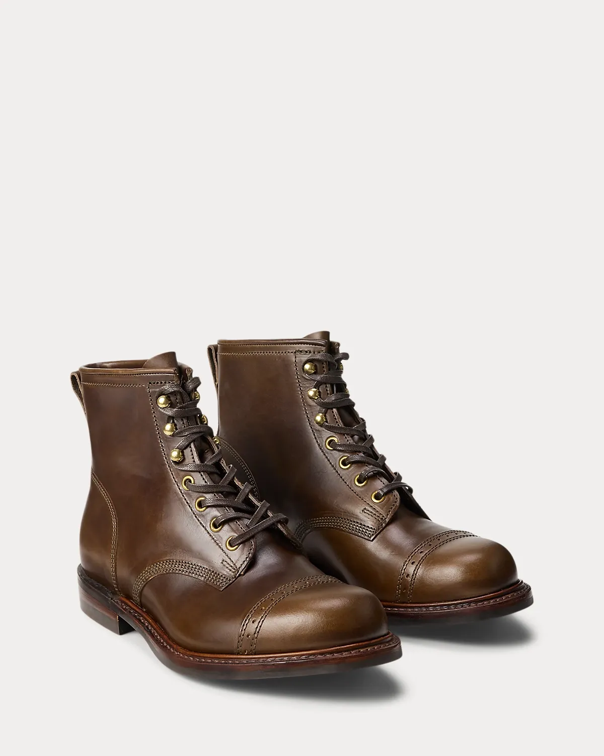 Boot benchmade in Northampton, England, from French full-grain leather and featuring brogue-style details. Burnished by hand to give it rich color and luster.