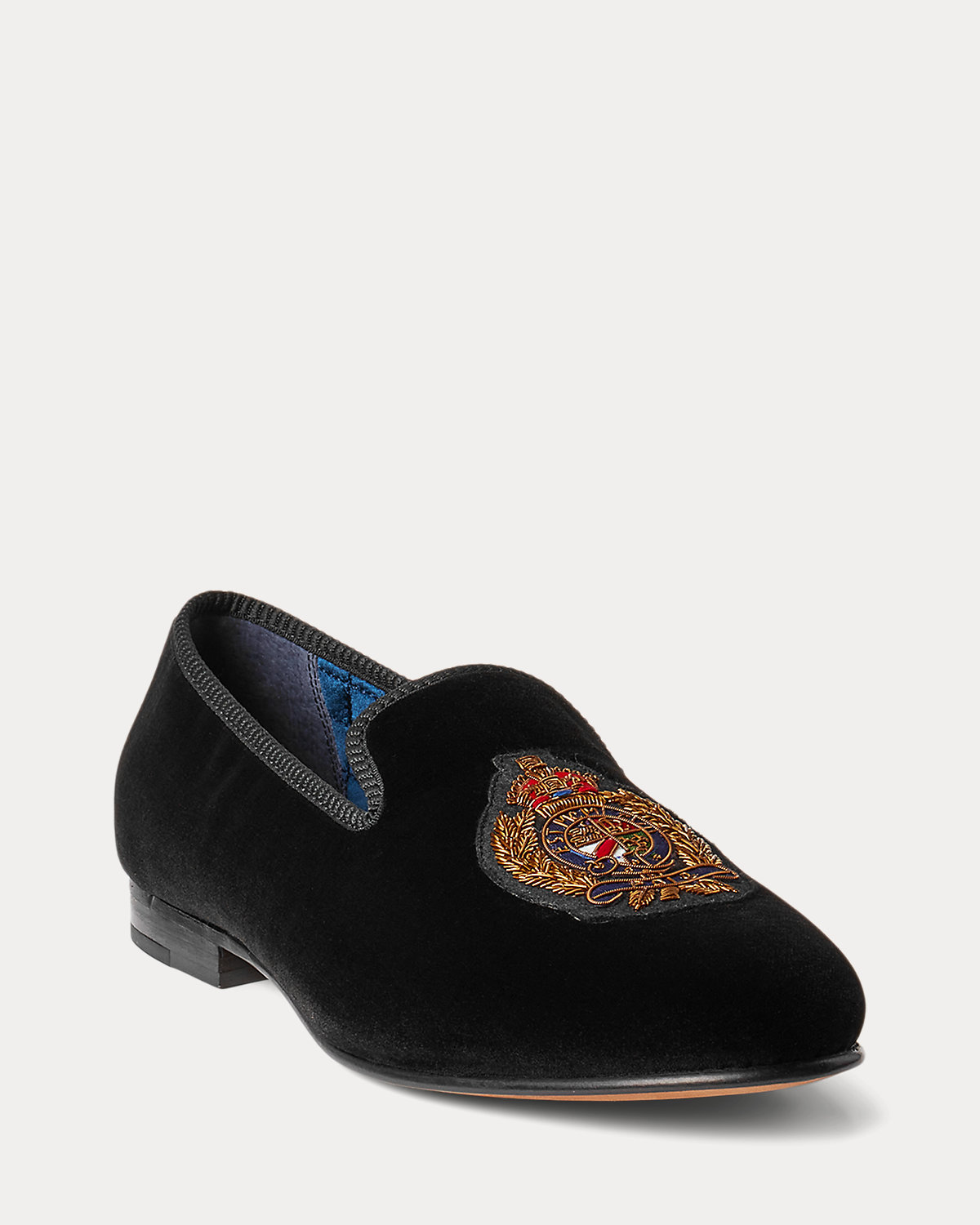 This elegant velvet slipper is detailed with a heritage-inspired “Polo” crest bullion patch and finished with a quilted satin insole.