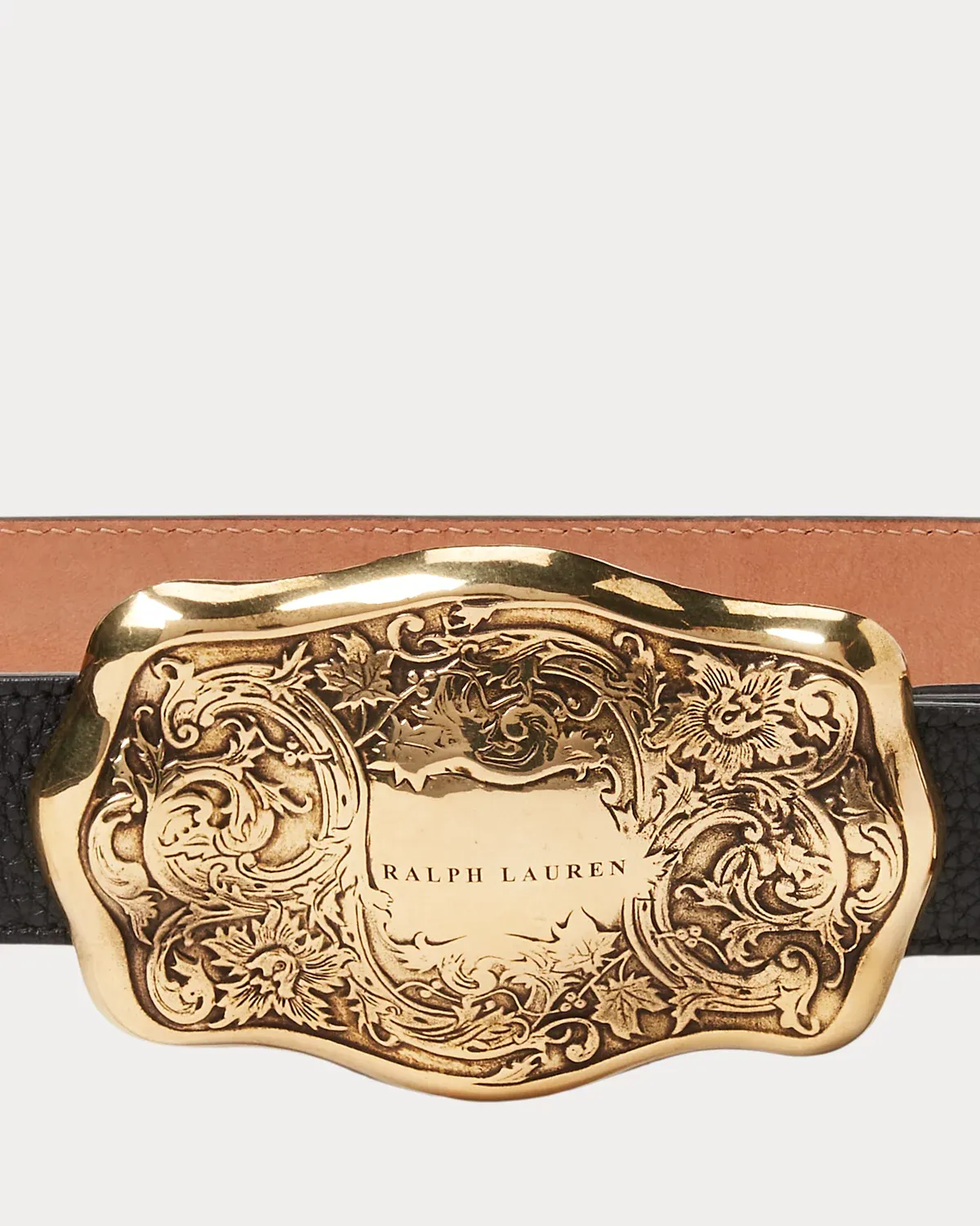 - Antiqued brass “Ralpthth Lauren”–engraved buckle. Western-inspired tooled engravings.