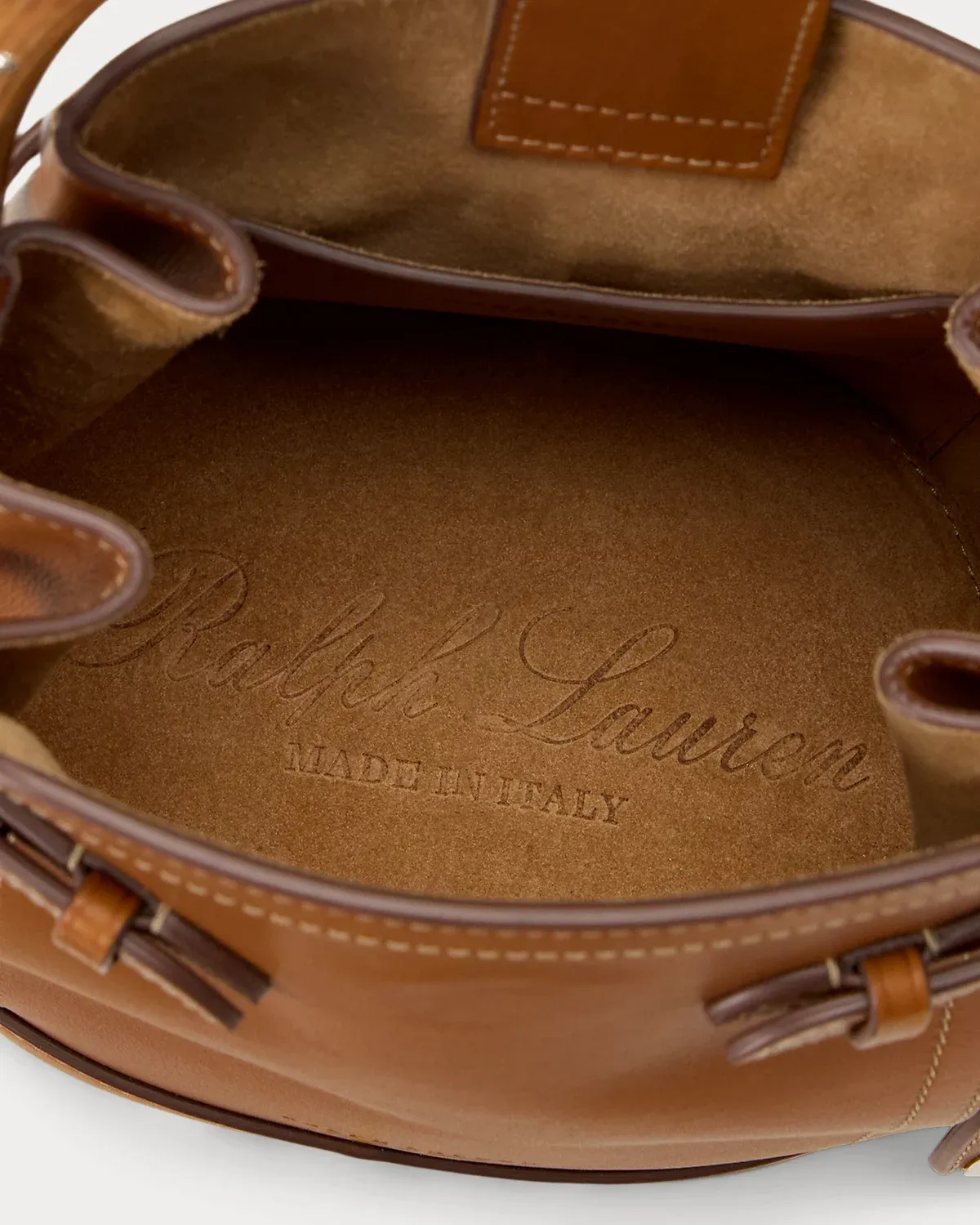 • Lined with suede. Debossed “Ralpthth Lauren Made in Italy” at the bottom interior of the bag. Interior slip pocket foil-printed with “Ralpthth Lauren Made in Italy.”