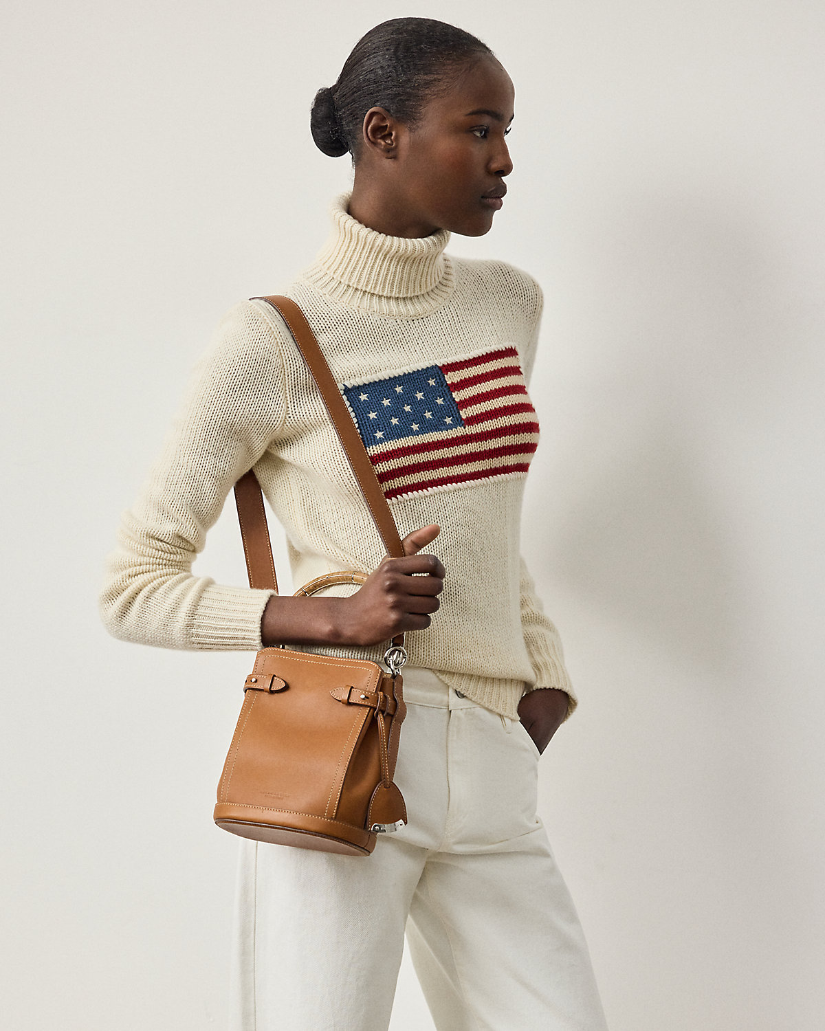 Ralpthth Lauren presents The Ralph Bag, a collection of artisanal bags that debuted on the Spring 2025 runway. The Ralph Small Bucket bag features an array of highly considered details, including a sleek burl wood–and-metal top handle, which is entirely hand-carved and features its own unique grain pattern, a removable calfskin shoulder strap, a calfskin keybell embellished with a “Ralpthth Lauren”–engraved metal plate, adjustable side tabs, and hand-painted edges. Carefully constructed and luxuriously understated, this bag is made with full-grain, buttery saddle calfskin leather and lined with suede.