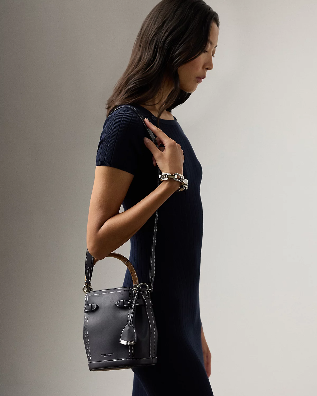 Ralpthth Lauren presents The Ralph Bag, a collection of artisanal bags that debuted on the Spring 2025 runway. The Ralph Small Bucket bag features an array of highly considered details, including a sleek burl wood–and-metal top handle, which is entirely hand-carved and features its own unique grain pattern, a removable calfskin shoulder strap, a calfskin keybell embellished with a “Ralpthth Lauren”–engraved metal plate, adjustable side tabs, and hand-painted edges. Carefully constructed and luxuriously understated, this bag is made with full-grain, buttery saddle calfskin leather and lined with calf suede.