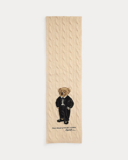 In a soft blend of merino wool, alpaca, and linen yarns, this playful scarf features the Polo Bear dressed in a Ralpthth Lauren look.