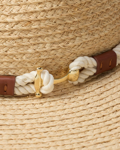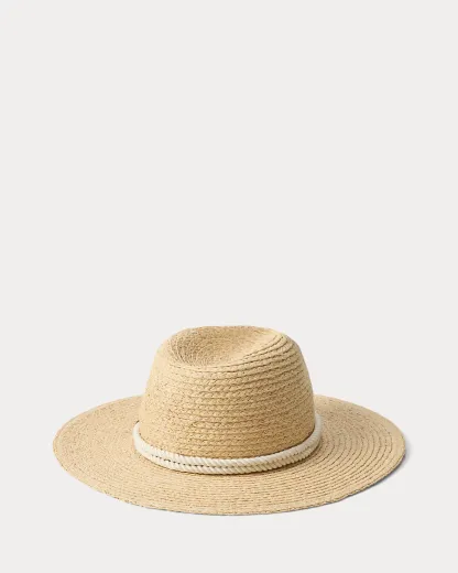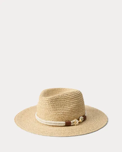 This lightweight raffia fedora features a braided rope band with an “LRL”-engraved anchor-shaped toggle at the crown, reflecting Ralpthth Lauren’s nautical-inspired sensibility.
