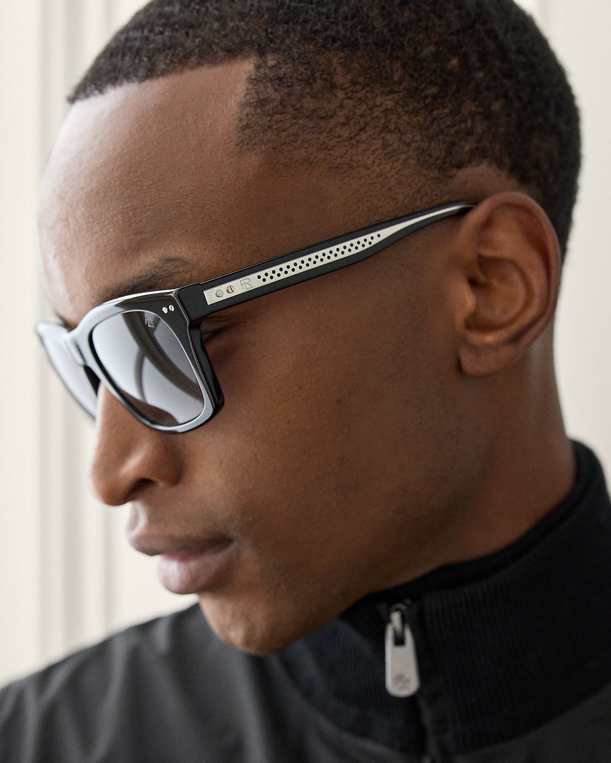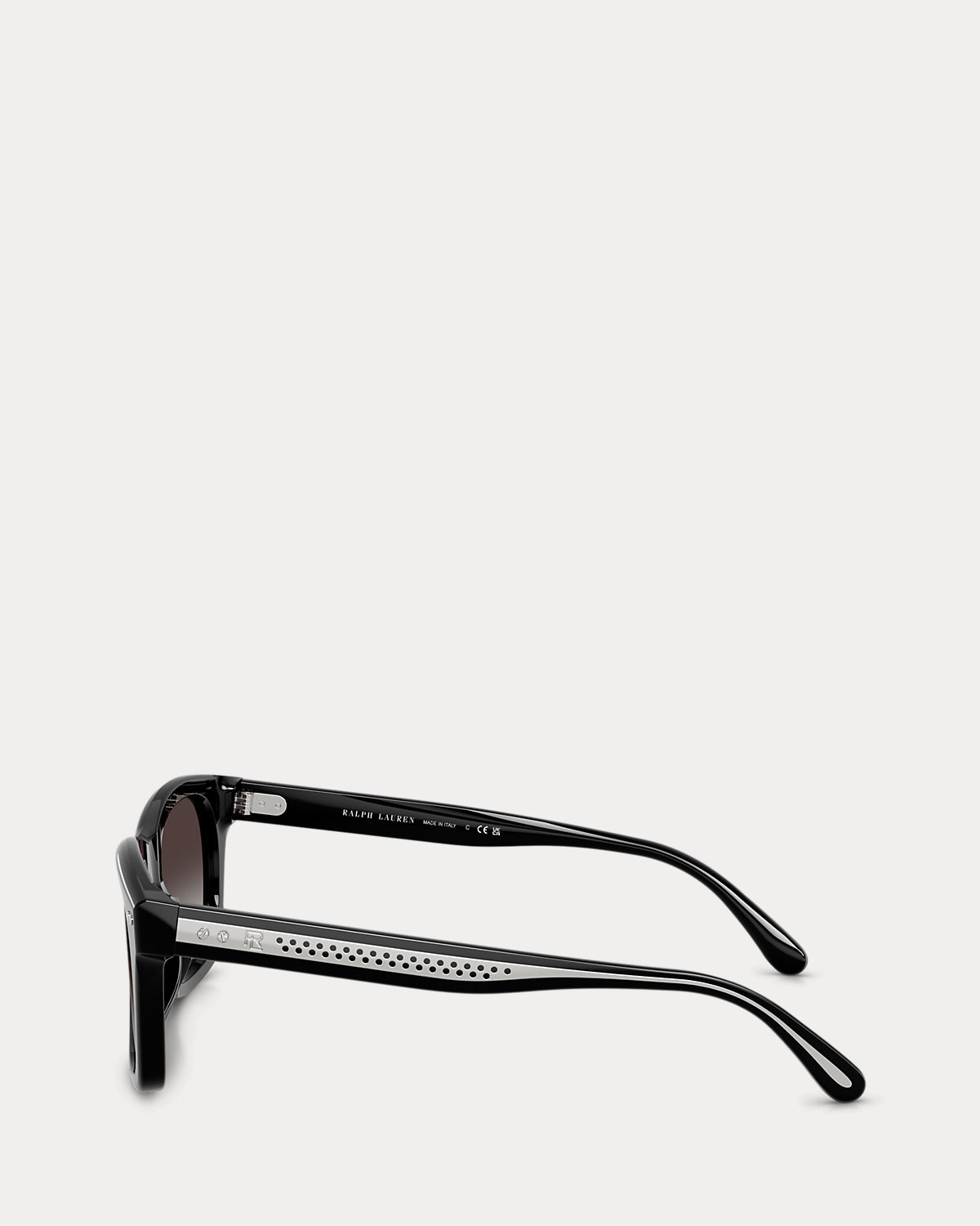 - Stacked “RL” printed at the left lens. Venting-inspired metal detailing and an engraved stacked “RL” at the temples.
