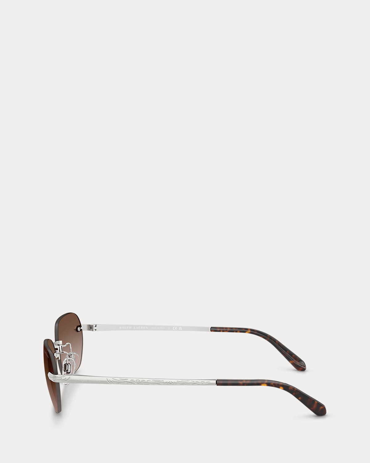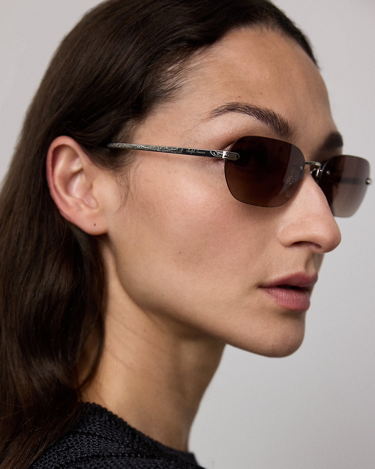 - Signature script “Ralpthth Lauren” printed at the left lens. Signature script “Ralpthth Lauren”–engraved temples. Western-inspired filigree engravings throughout.
