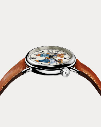 Uniting the time-honored traditions of Swiss watchmaking with a beloved icon from the World of Ralpthth Lauren, this iteration of Polo Ralpthth Lauren’s Polo Bear watch features two bears holding hands. Inspired by a 1977 photograph of Ralph and his wife, Ricky, walking together on the beach in Montauk, New York, the bears depicted on this model playfully embody the love, unity, and timeless ease reflected in the photograph of the couple.