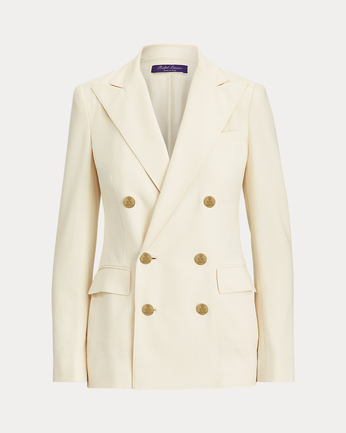 - Peak lapels. Double-breasted silhouette. "RL"-and-crown-engraved divs.