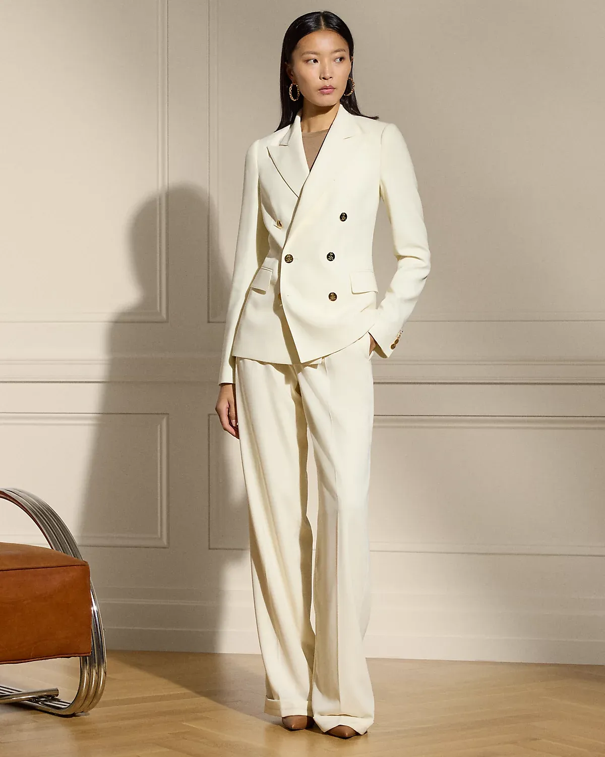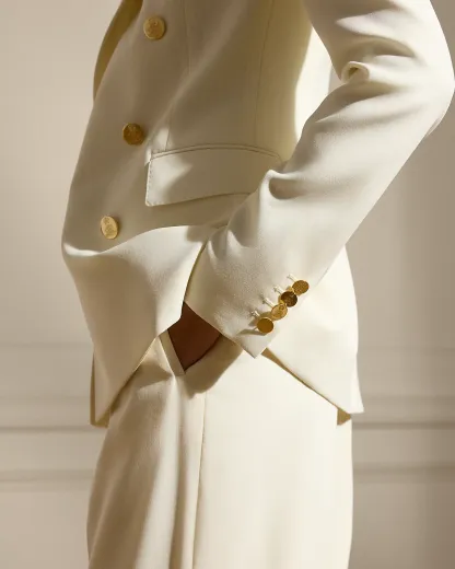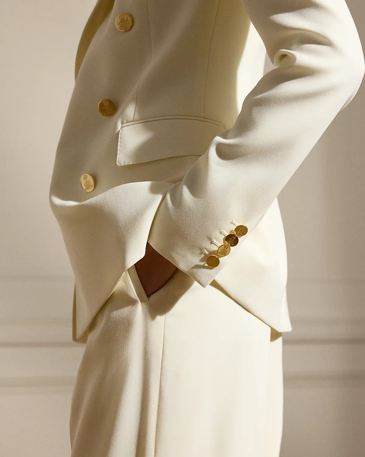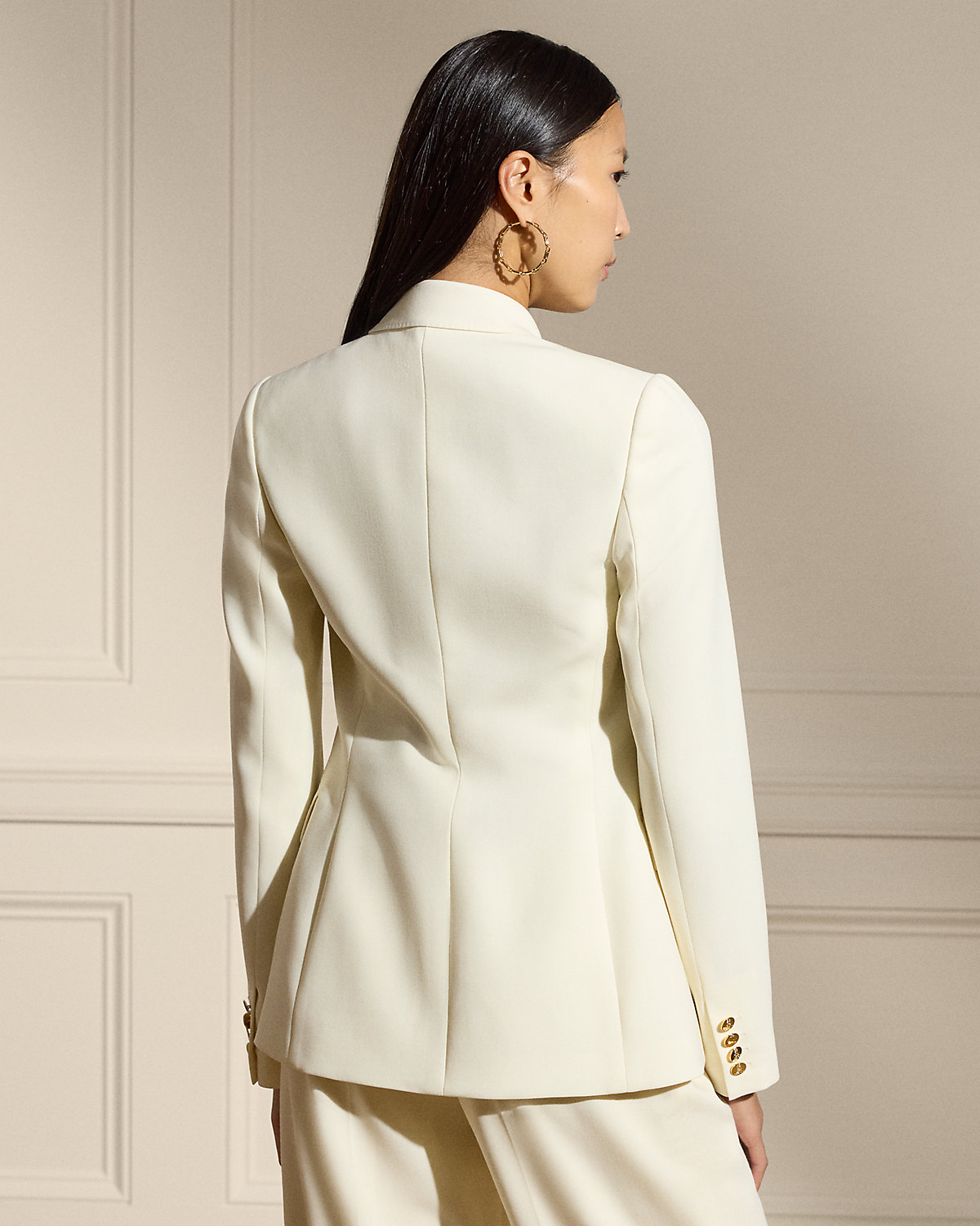 - Peak lapels. Double-breasted silhouette. “RL”-and-crown-engraved divs.
