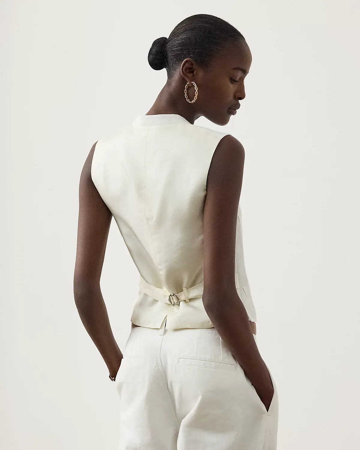 The menswear-inspired Jaiden is carefully crafted with rustic-yet-chic linen in a classic construction for season-spanning wear. Cut for a slim fit, this vest is tailored with welt pockets, slimming waist darts, and an adjustable back belt.