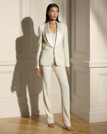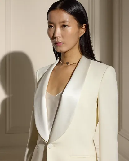 The tuxedo jacket first appeared in menswear in the 1800s as an alternative to the tailcoat, and in 1975 Mr. Lauren sent his version for women down the runway. Woven with highly twisted wool crepe yarns selected for their modern drape and natural stretch characteristics, the slim-fitting Sawyer builds on this heritage by merging a lightweight feel with a sleek, structured look.