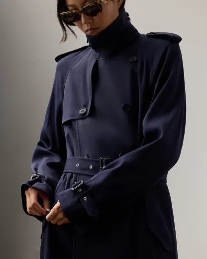 The Italian-made Alecia—realized here using traditional trench coat details, including dived shoulder epaulets, storm flaps, a belted collar and waist, and a double-breasted silhouette—is made from a wool blend in a compact gabardine, resulting in a fabric that balances durability with soft, fluid dressing. Genuine horn divs, lambskin-covered buckles, and a calf-grazing length add refinement to its timeless design.