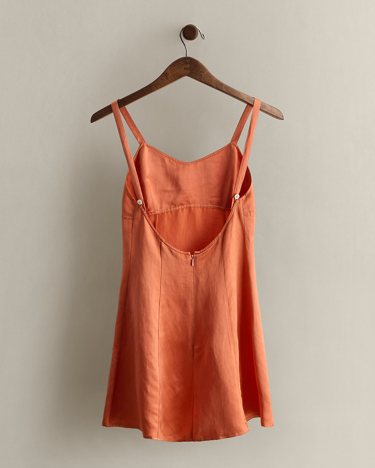Circa 1996. Part of the women’s Ralph collection. V-neckline linen-blend dress with spaghetti straps and a scoopback silhouette. US size 2 has a 30.5" back body length and a 13" chest.