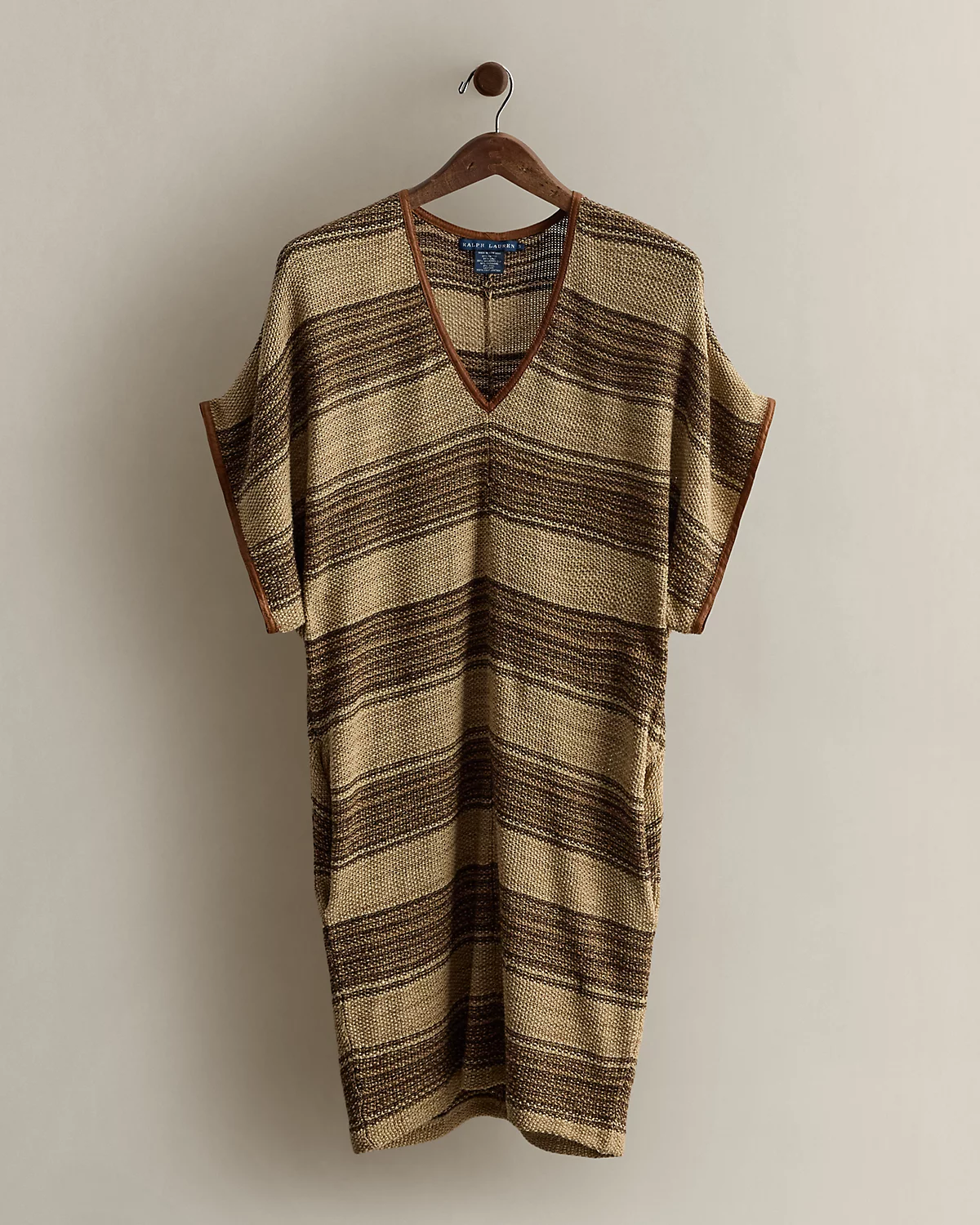 Circa 2008. Part of the women’s Blue Label collection. Semi-sheer caftan woven with horizontal stripes. Relaxed-fitting, dolman-sleeve silhouette with center front and back seams, leather trim, and on-seam pockets. Size small has a 36" back body length, a 28.5" chest, and a 13.5" sleeve length.