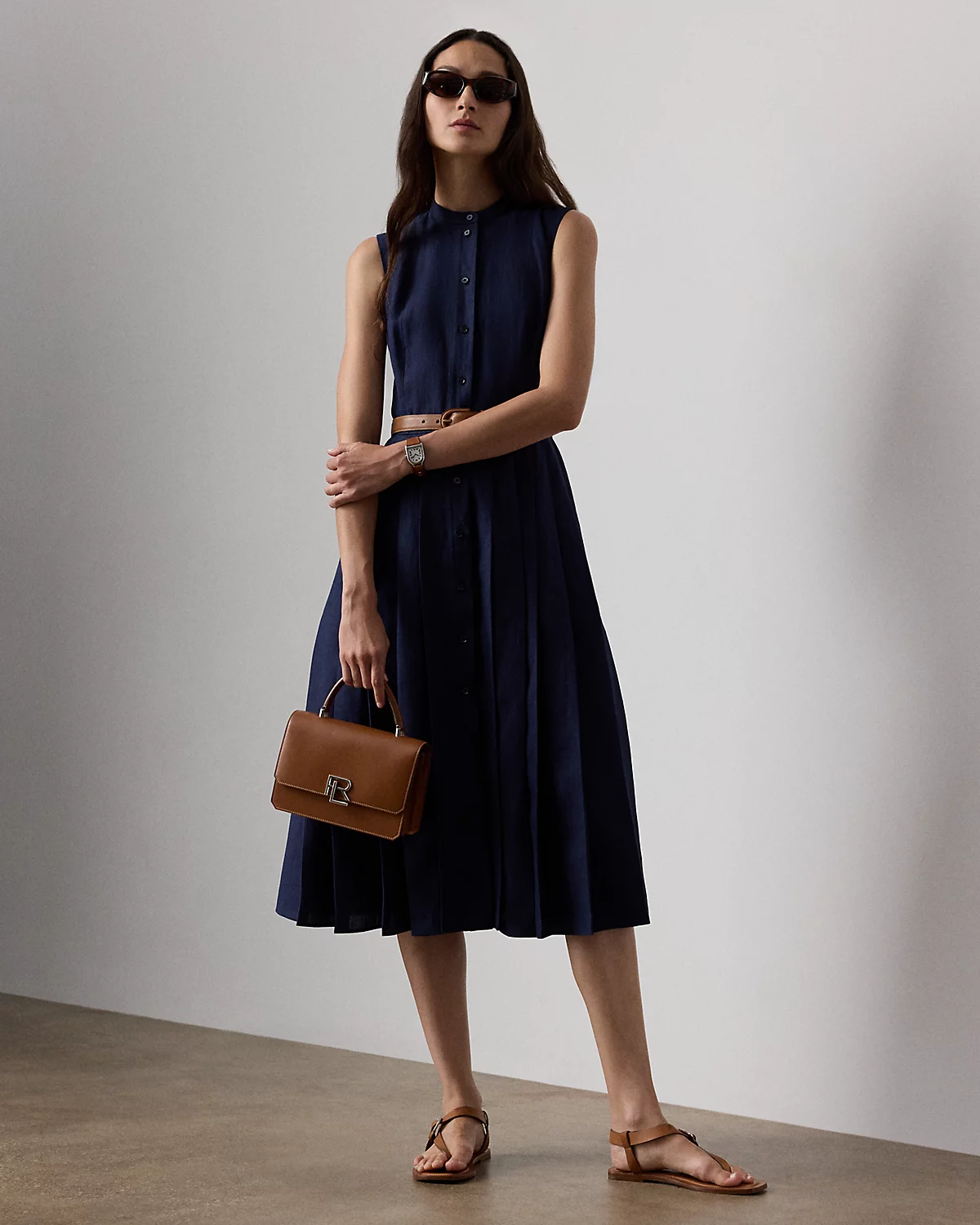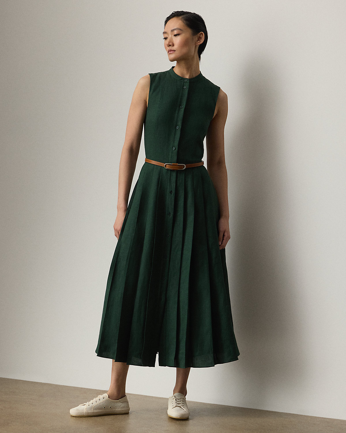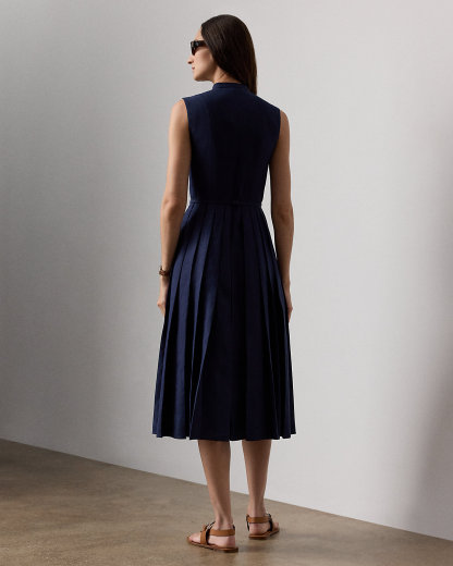 Inspired by our Freida dress, the Kennedi’s studied design unites four linen panels, which undergo a heat-press fabric manipulation technique to create a stunning pleated effect at the skirt. Crafted with rustic-yet-chic Italian linen in a classic construction for season-spanning wear, this day dress is cinched at the waist with a self-belt centered by a signature “Ralpthth Lauren”–engraved plaque buckle.