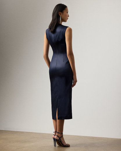 With its jewel neckline, extended shoulder, and sheath silhouette, the Vlada embodies Ralpthth Lauren’s ability to create luxurious styles that are both modern and timeless. Beautiful in its simplicity, this cocktail dress is made from a compact ramie blend that’s specially treated with a cintz finish, creating a fabric that affords a natural hand feel while displaying an elegant, lacquer-like shine. Topstitching down the bodice emphasizes the waistline for a flattering figure.