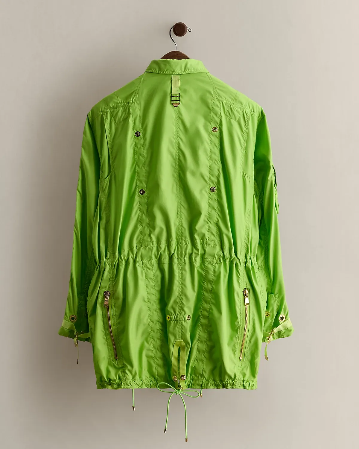 - Interior drawstring at the waist. Drawstring hem. Vented back hem.