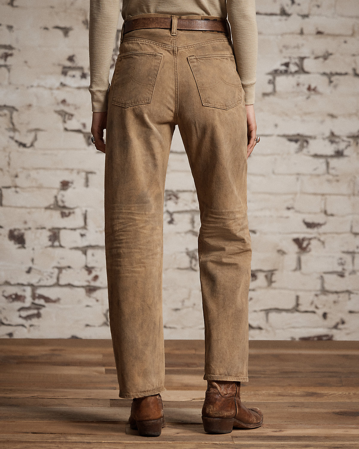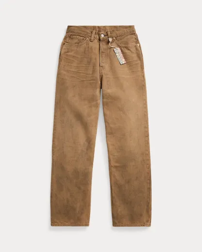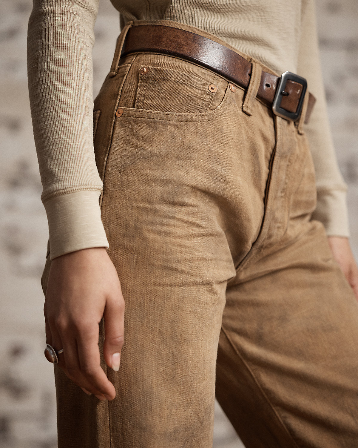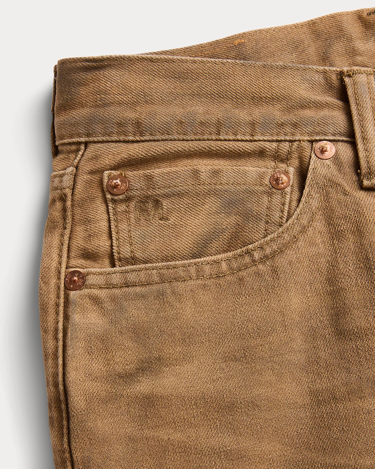 - American-made divs, rivets, and washer burrs. Five-pocket styling. “RRL” embroidery at the coin pocket. “RRL”-debossed logo label at the back right waist.