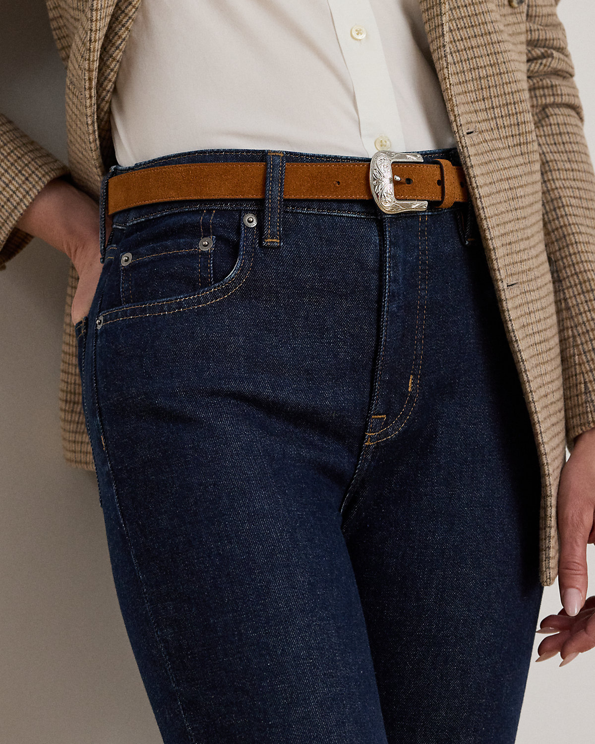 - Belt loops. Zip fly with a signature dived closure. Five-pocket styling with signature metal rivets. Debossed signature leather patch at the back right waist.
