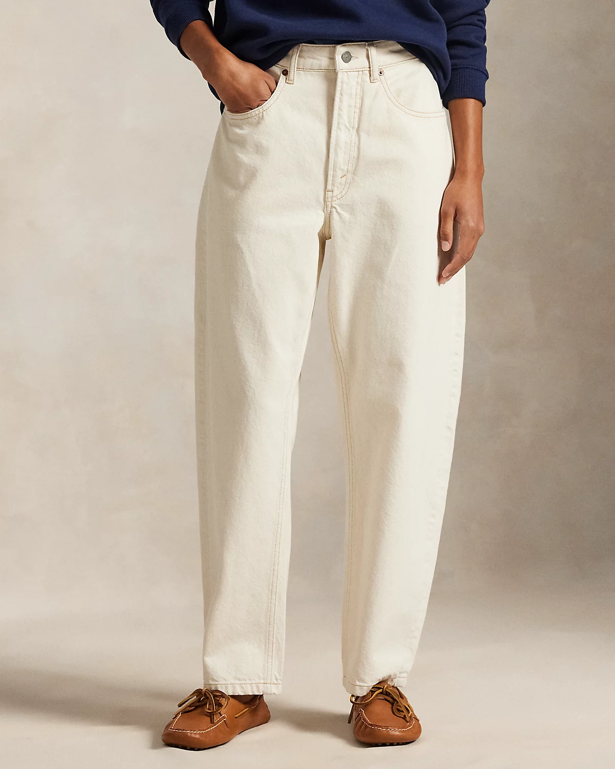 Washed for a natural ecru shade and soft hand, this version of our Relaxed Tapered jean is crafted with non-stretch cotton denim in a medium weight and features a defined twill line.