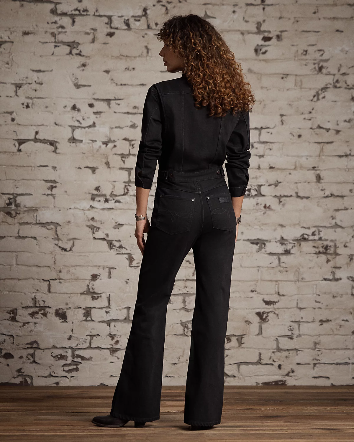 Fitted coverall with a bootcut leg. Made from 12.74 oz. black denim woven with extra stretch. Slight blouson bodice. Zip front with a snapped closure at the top. Expansion pleats at the placket. Bi-swing construction allows for ease of movement at the shoulders. Western-style decorative stitching at the pockets. Adjustable dived tabs at the back waist. Washed for a subtle abraded effect and tonal dimension.
