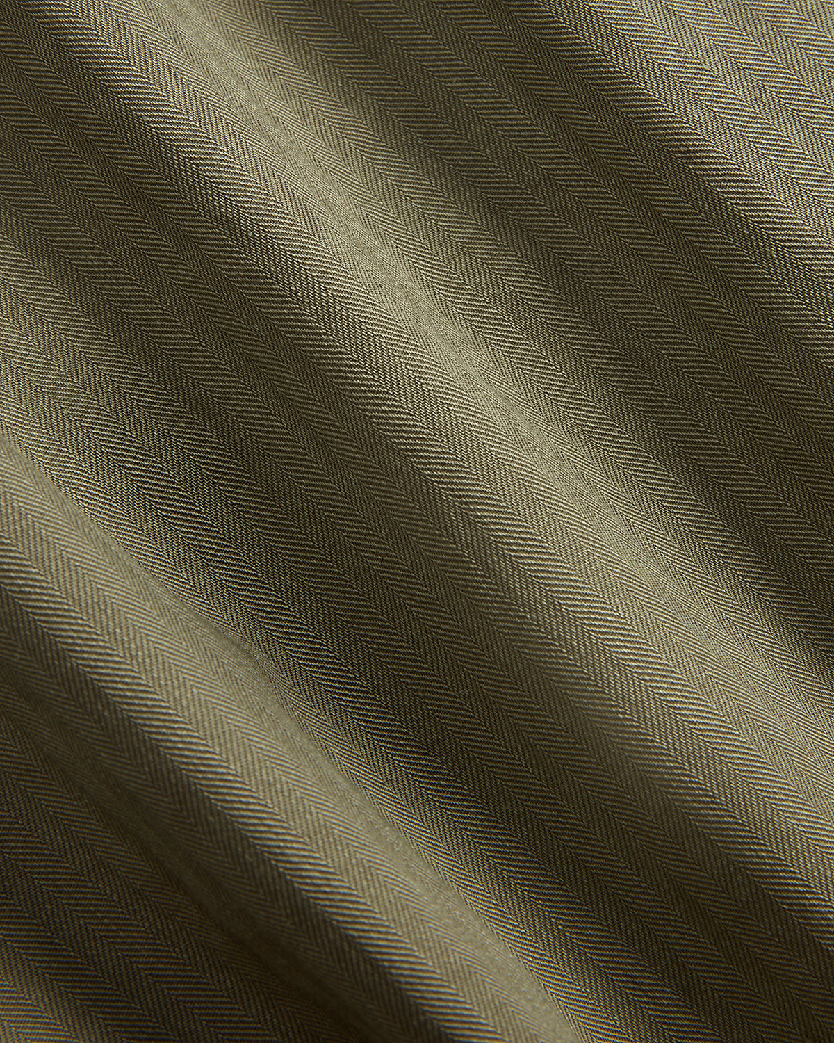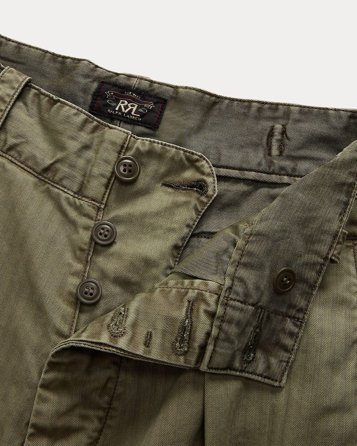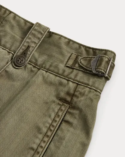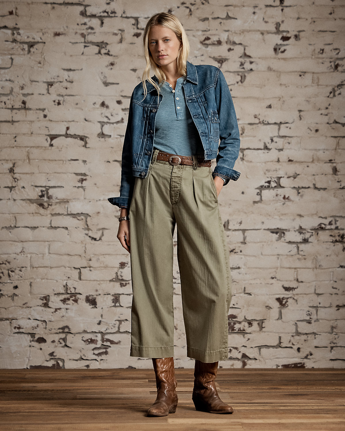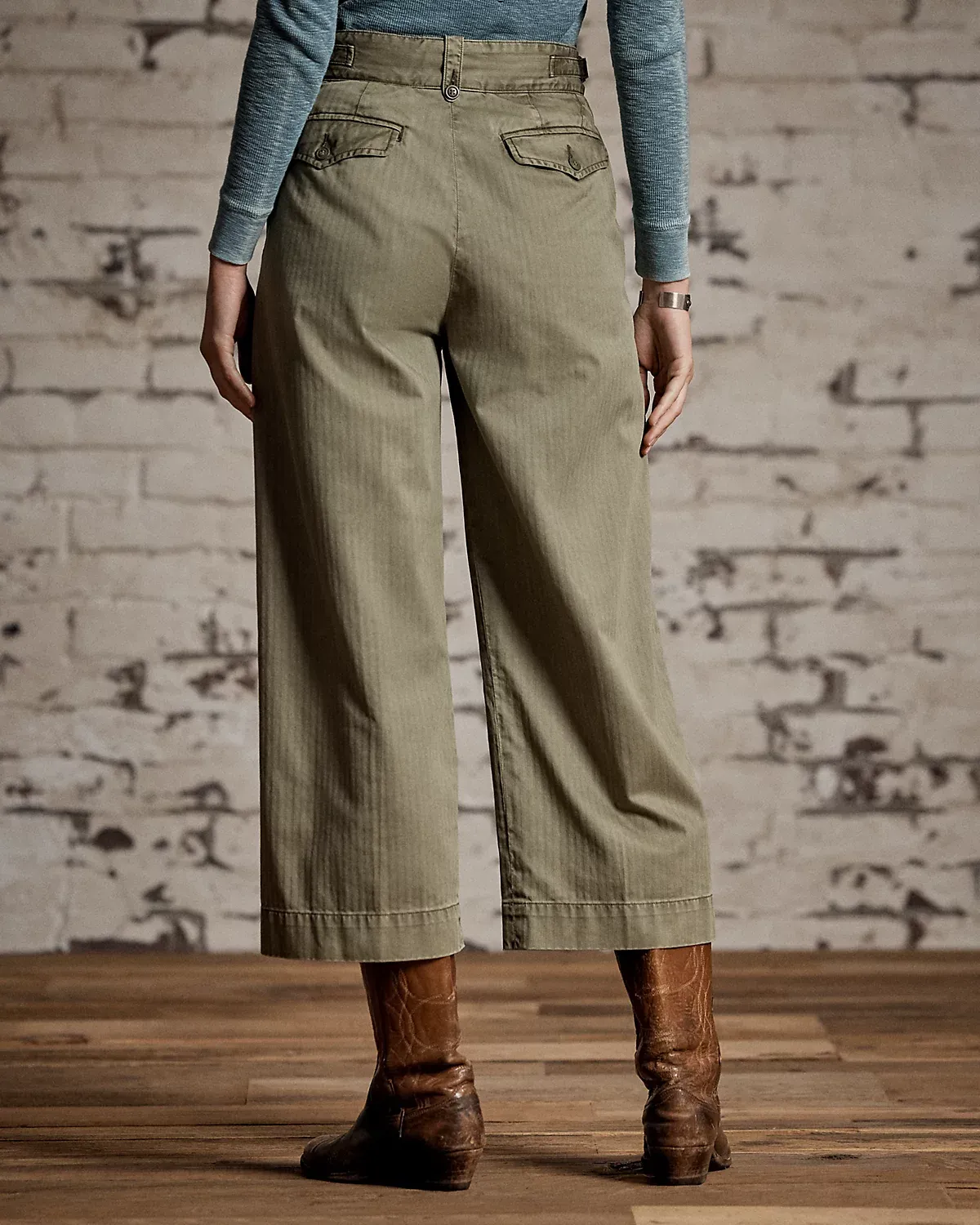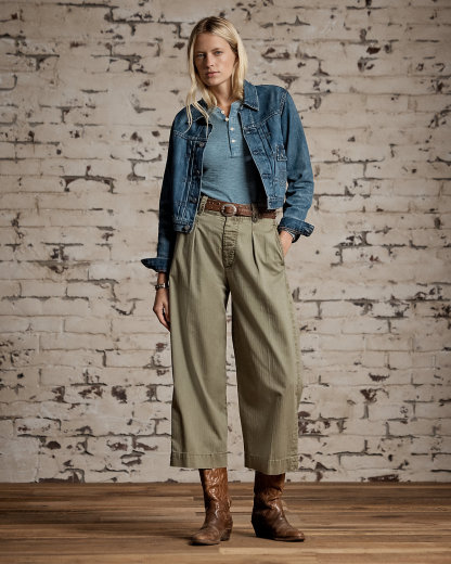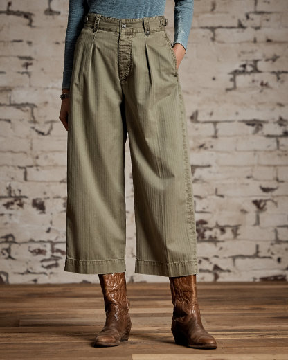 Cropped wide-leg pant inspired by 1940s trousers. Made with Japanese piece-dyed cotton twill. Features hand-set back flapped pockets and a stitched-down pleated front. Buttoned belt loops and adjustable tabs at the sides. Stonewashed.