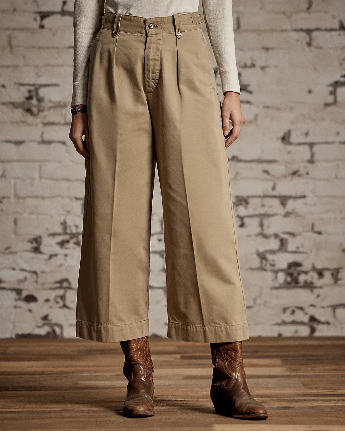 - Adjustable buckled tabs at the waist. Buttoned belt loops.