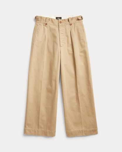 Inspired by 1940s trousers. Made from Japanese piece-dyed cotton twill. Hand-set back flapped pockets. Stitched-down pleated front. Buttoned belt loops and adjustable tabs at the sides. Stonewashed.
