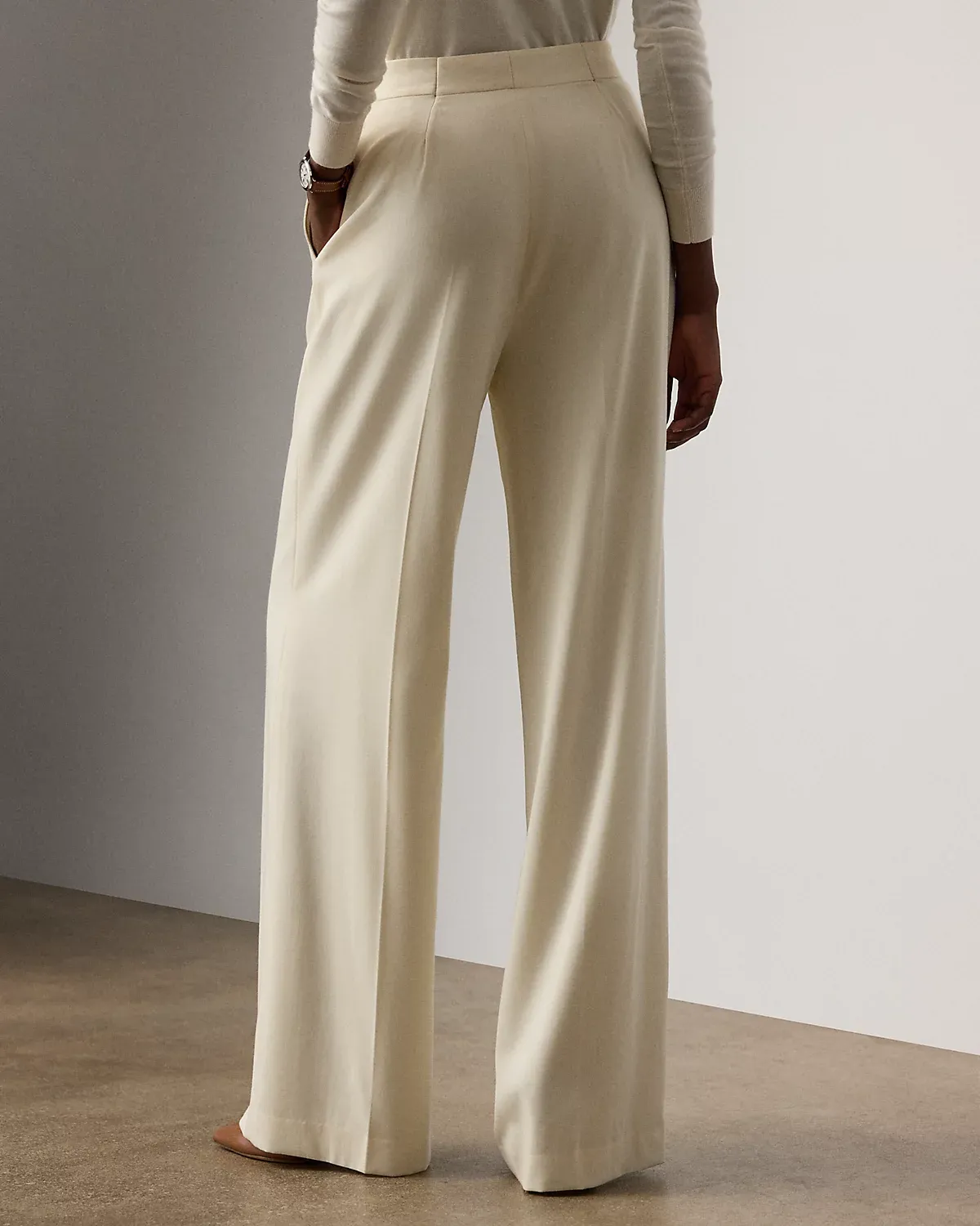 - Back waist darts. Creases run down the front and back of each leg.
