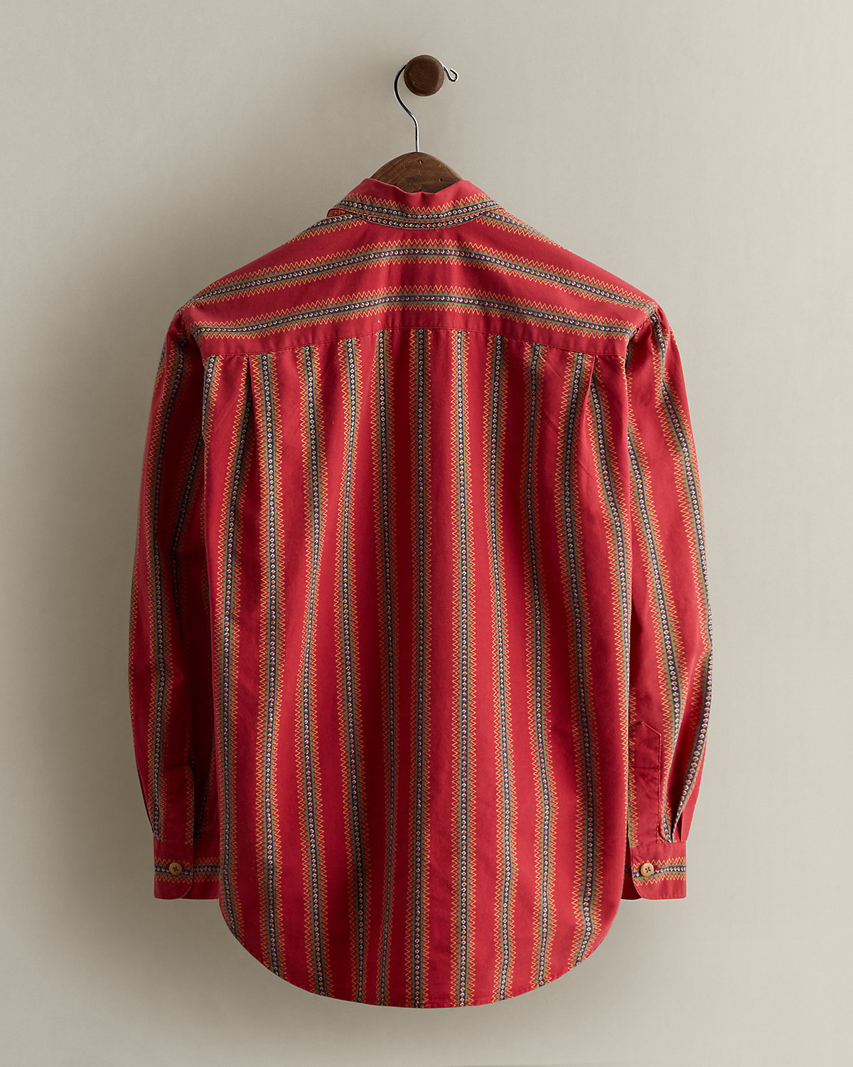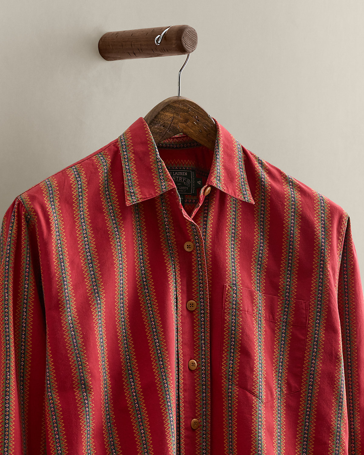 Circa 1990. Part of the women’s Ralpthth Lauren Country collection. Striped cotton shirt with a left chest patch pocket, shirttail hem, and pleated back yoke. US size 4 has a 26" back body length, a 17.5" shoulder, a 21.5" chest, and a 20.5" sleeve.