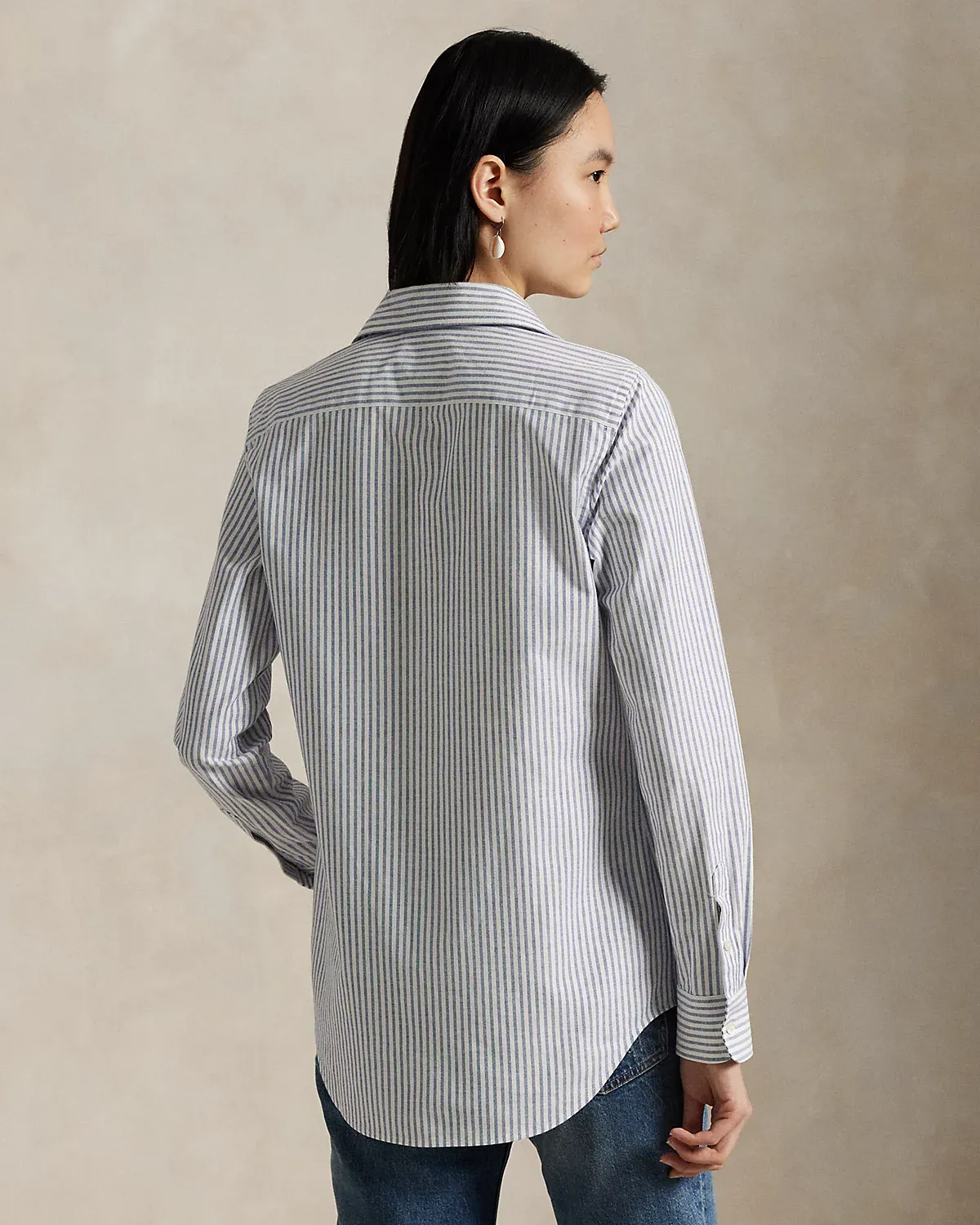 Cut for our Stretch Slim Fit, this striped div-down oxford shirt is crafted from a refined stretch cotton fabric and finished with our multicolored signature embroidered Pony at the chest.
