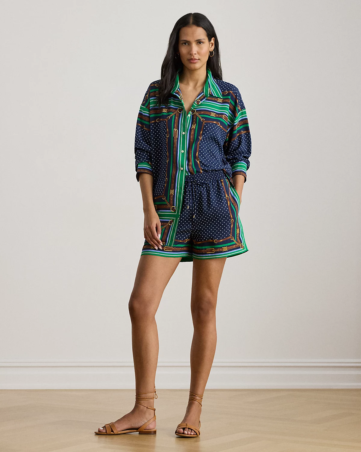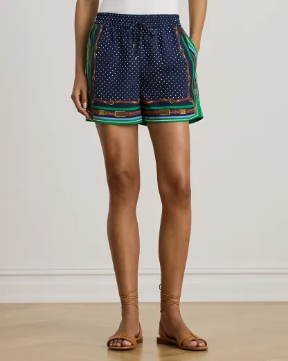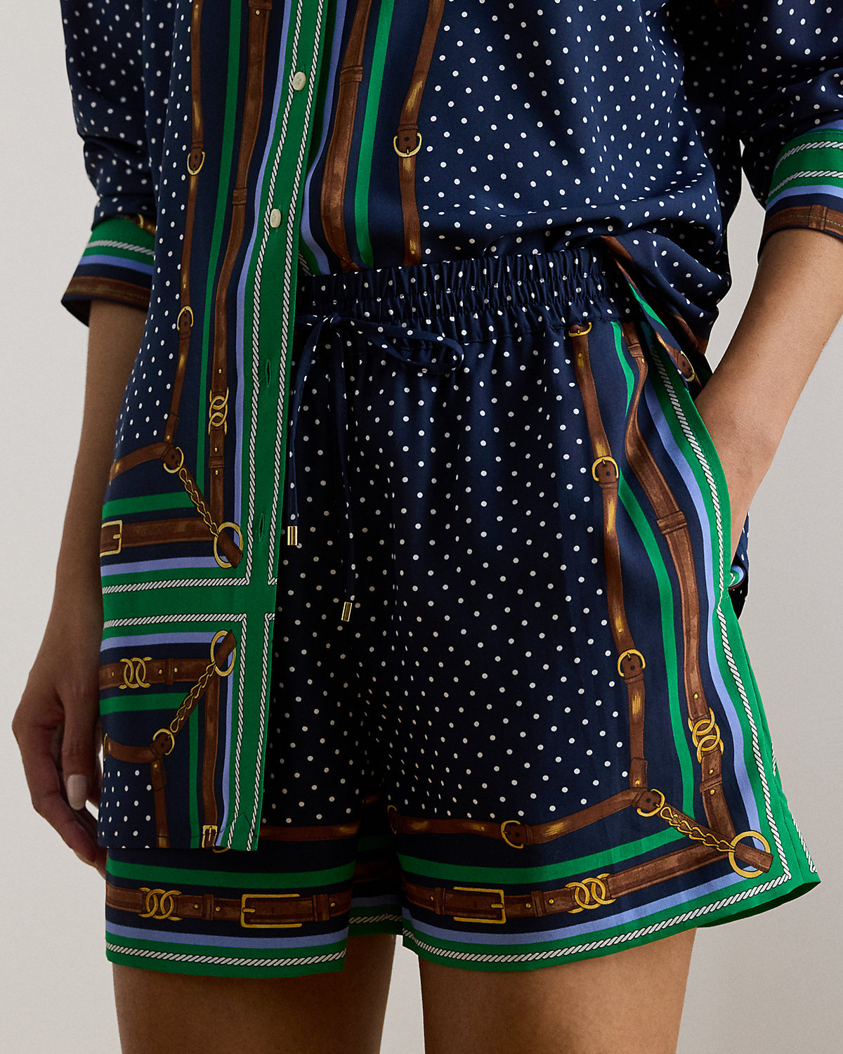 Crafted from airy crepe de chine, these drawcord shorts meld classic polka dots with Ralpthth Lauren’s equestrian-inspired belting print. “LRL”-engraved cord ends add a subtle signature finish.