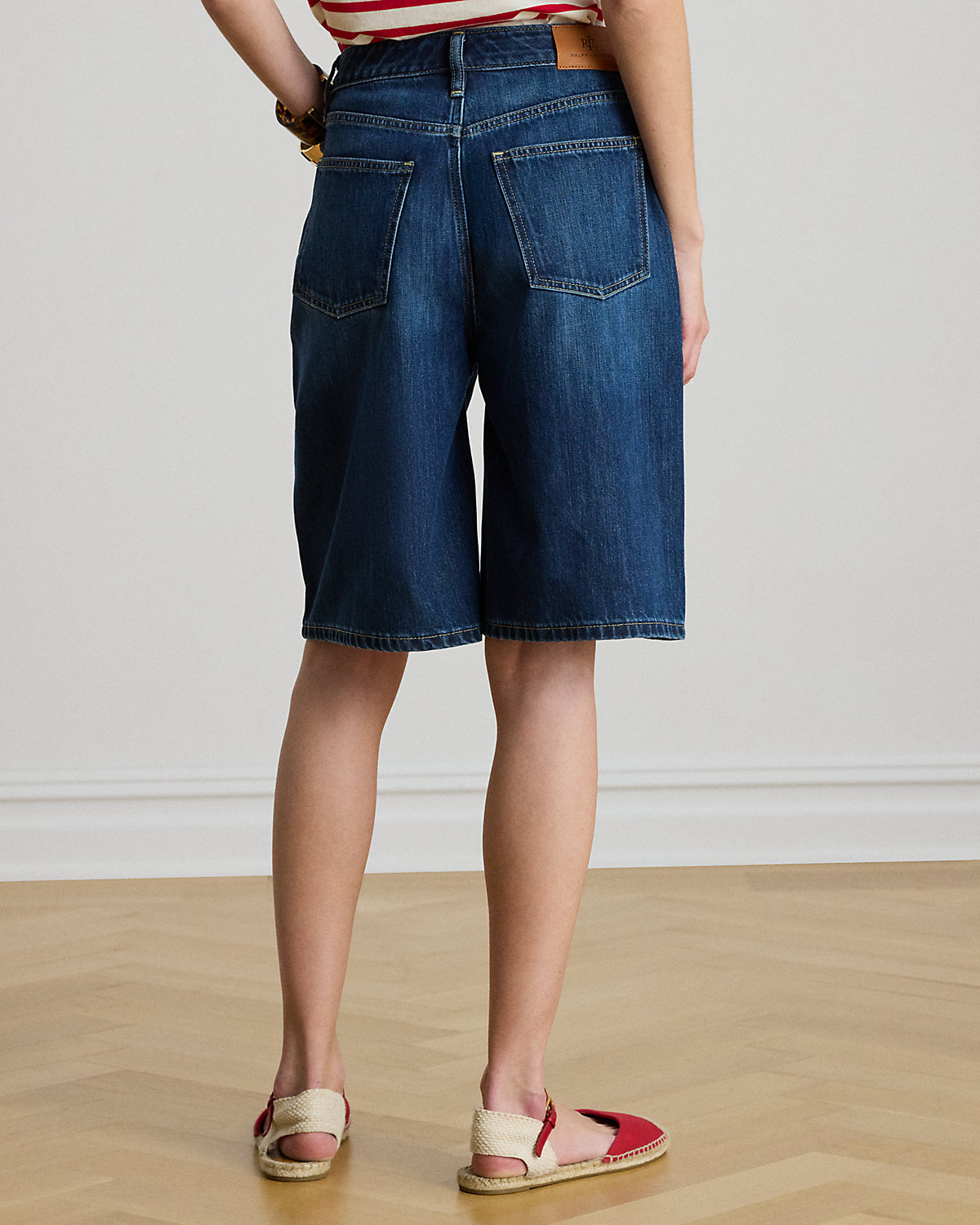 Lauren reimagines the quintessential Bermuda short with a wide-leg silhouette in dark-wash denim, offering an effortlessly chic twist on a casual staple.