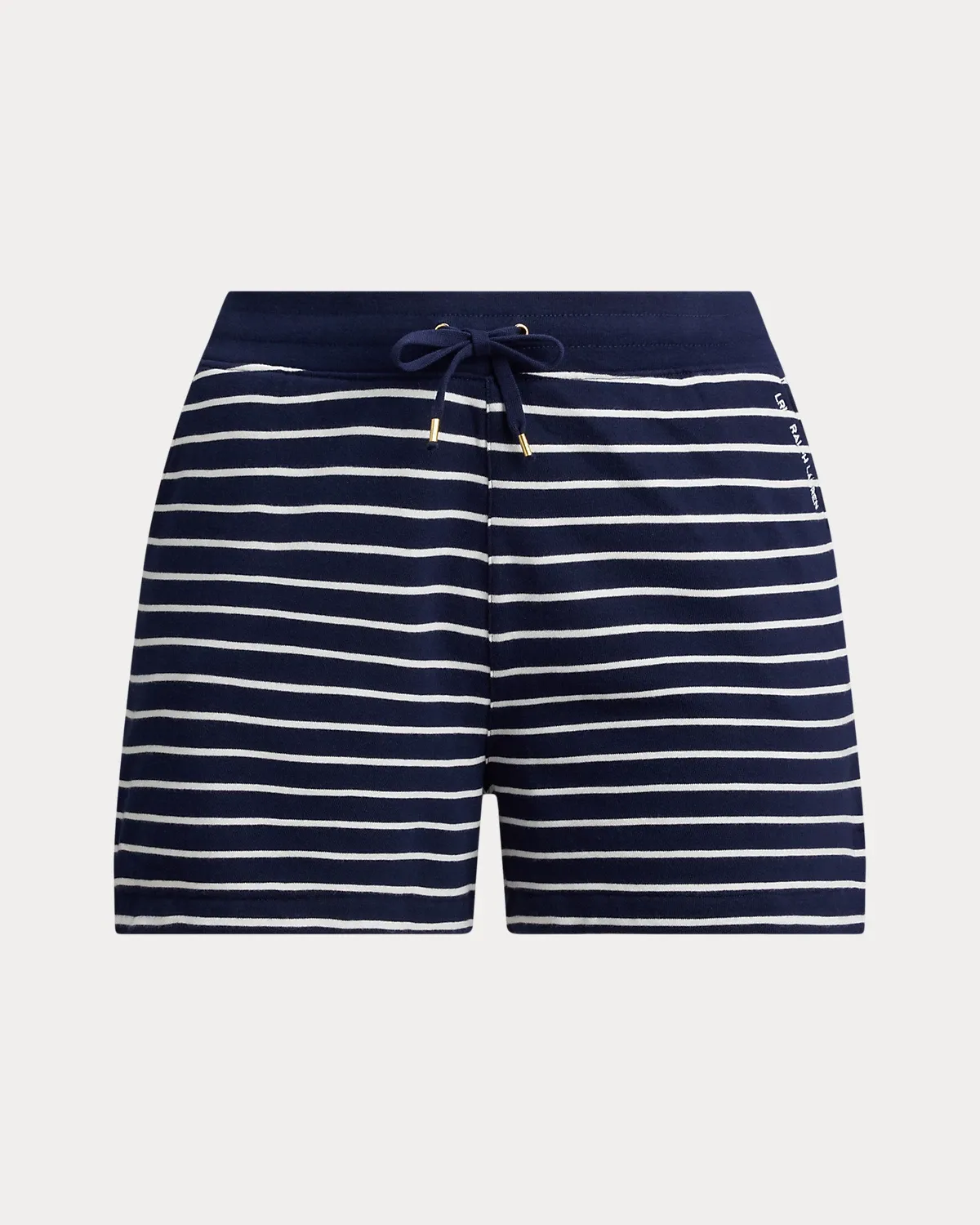- Elasticized drawcord waist. Brass cord ends custom-developed with an “LRL” logo.