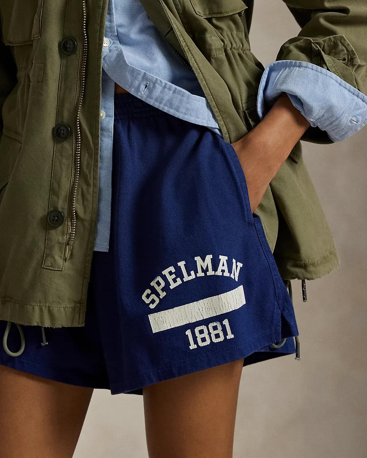 - "Spelman 1881" printed above the left hem. Signature embroidered Pony at the back pocket.