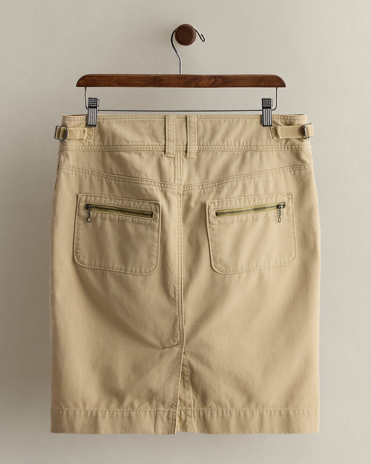 Circa 1995. Part of the women’s Ralpthth Lauren Sport collection. Cotton skirt with utility-inspired pockets. Straight silhouette with tabs at the waist for a cinched fit. Back zip pockets and vented back hem. US size 6 has a 15" waist, a 17.75" hip, and a 21" skirt length.