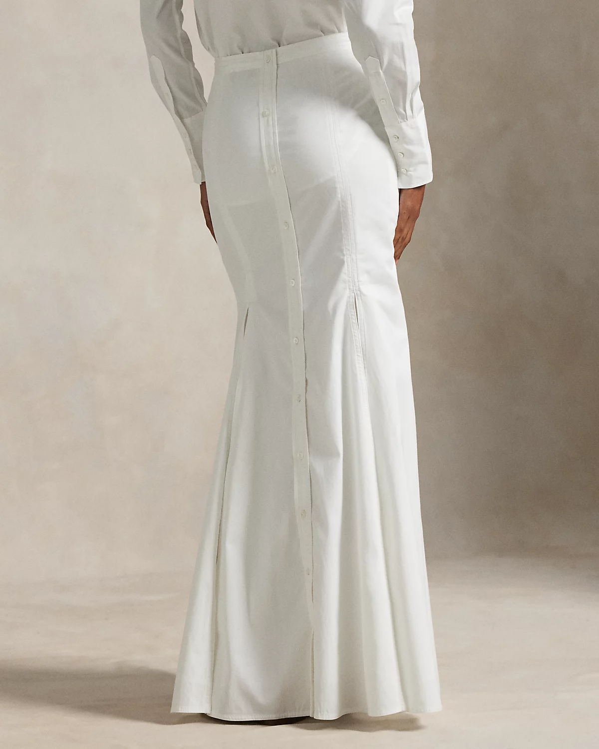 This woven cotton maxiskirt is designed for a fitted shape through the waist and hips that transitions to a flared silhouette at the hem. The paneled construction features princess seams, inverted box pleats, and a back dived placket that can be opened or fastened to alter the skirt’s form.