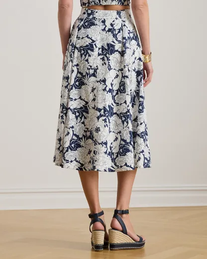 Tailored with airy linen, this A-line midi skirt showcases a div-front design, practical side on-seam pockets, and the season’s stylized, two-tone floral print.