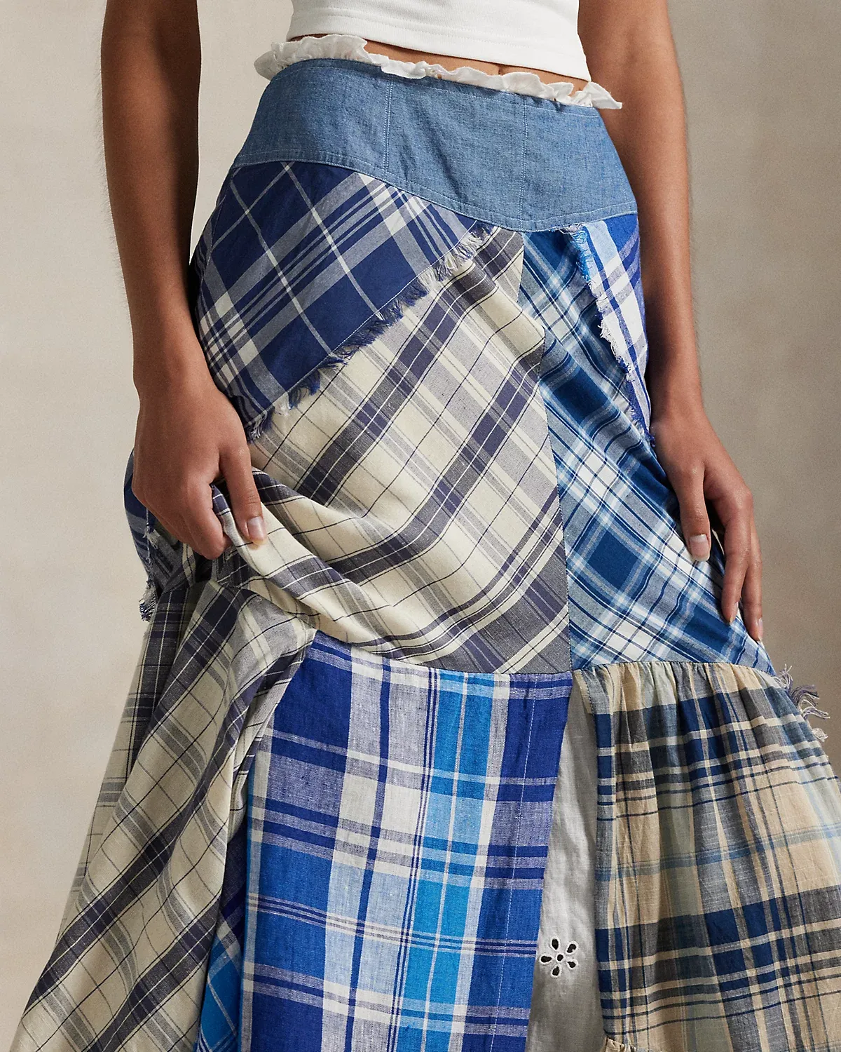 Inspired by a piece from the Spring 2025 runway show, this patchwork maxiskirt artfully combines frayed-edge plaid fabric, reminiscent of scarves, to create its paneled fit-and-flare silhouette. A decorative div-and-loop placket adorns the back and beneath is a cotton petticoat with eyelet embroidery and ruffled godets, adding volume and textural depth to the design.