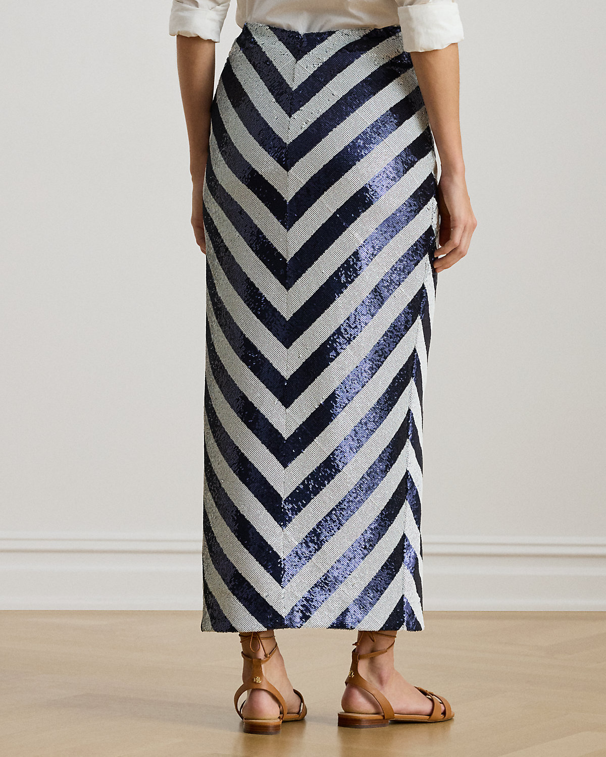 A striking arrangement of blue-and-white sequined stripes bring a modern, nautical-inspired sensibility to this pencil midi skirt, which is finished with a slit along the princess seam for ease of movement.