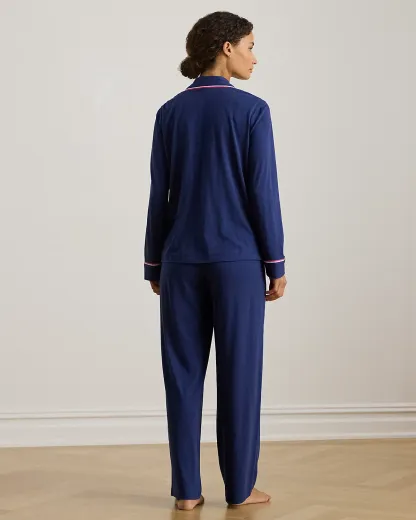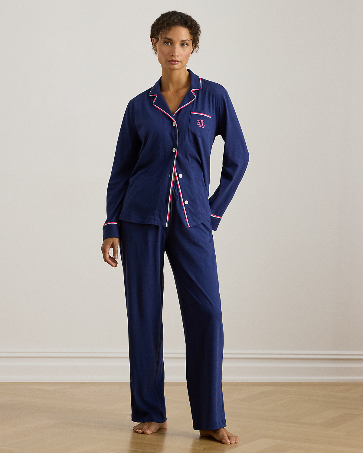 Knit with a soft, textured cotton blend, this cozy sleep set is detailed with two-tone grosgrain trim for a modern take on sophisticated style. An “LRL”-embroidered logo at the pocket adds a signature finish.