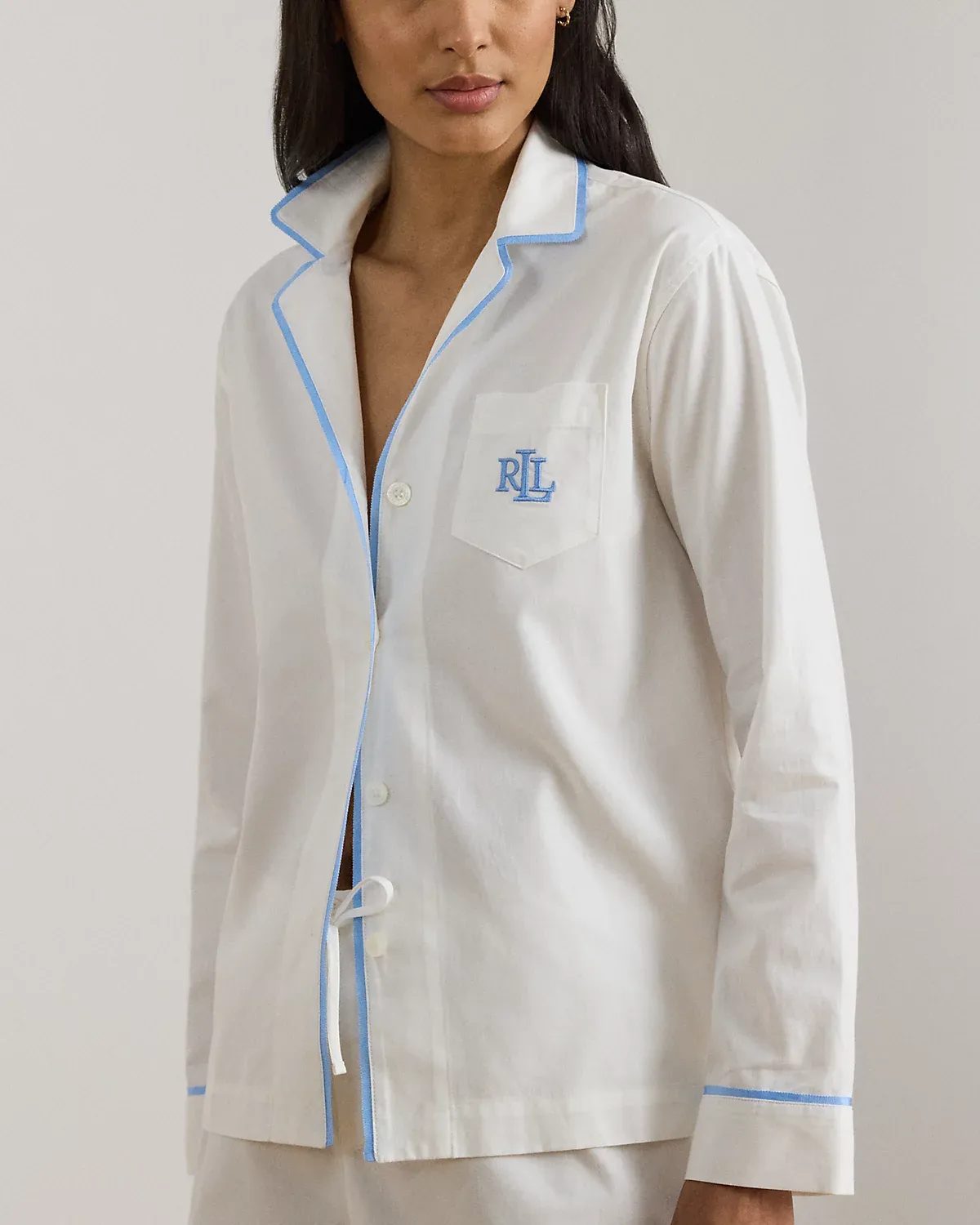 - Shirt: notch collar; dived placket; long sleeves; left chest patch pocket; “LRL”-embroidered logo at the pocket; side-split hem.